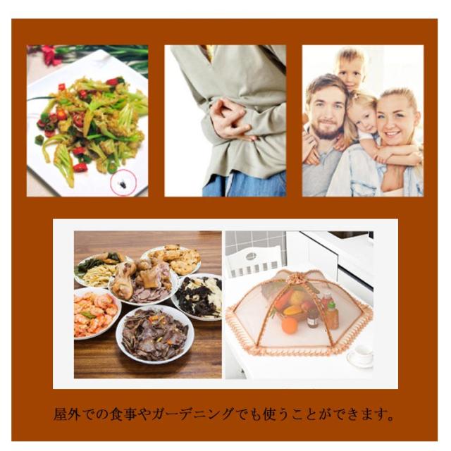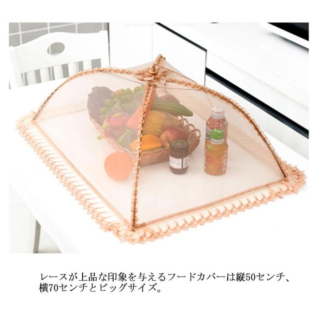 | ・ホコリ・虫からお料理を守る!メッシュ素材の食卓カバー ・レースが上品な印象を与えるフードカバーは縦50センチ、横70センチとビッグサイズ。 ・ラップの節約にもなるエコなメッシュ素材の食卓カバー。 ・熱がこもりにくく、出来立ての料理を冷ます際におすすめ。 ・お弁当の上に被せれば、熱を冷ましながら虫やほこり対策が可能です。 ・スチール製の骨組みで丈夫に作られています。 ・屋外での食事やガーデニングでも使うことができます。 ・使わない時は折りたたんで収納することができます。 ・紐を引っ張って開き、先端のボタンを押して閉じます。 ・生地は手洗いできるので、衛生的に使い続けることが可能。(※洗う際は爪などを引っ掛けて生地を破かないように注意しましょう。) | |