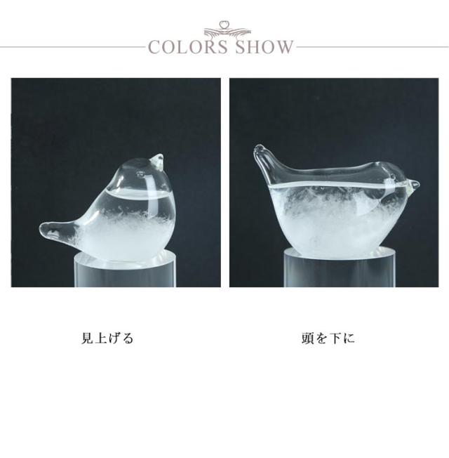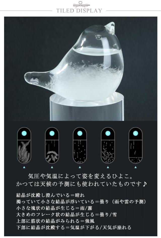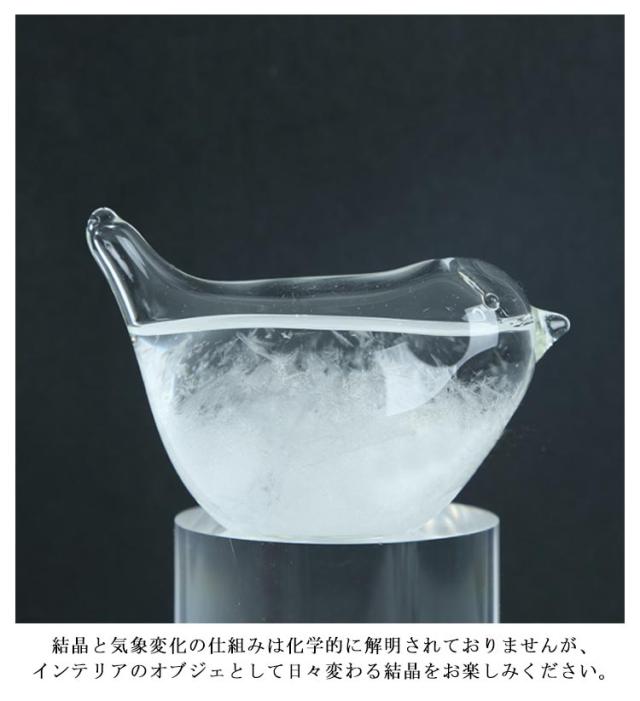 | 天候によって表情を変えるストームグラス 結晶の変化を楽しむオブジェ。 気圧や気温によって姿を変えるひよこ。かつては天候の予測にも使われていたものです♪ 結晶が沈殿し澄んでいる=晴れ 濁っていて小さな結晶が浮いている=曇り(雨や雷の予測) 小さな塊状の結晶が生じる=雨/霧 大きめのフレーク状の結晶が生じる=曇り/雪 上部に筋状の結晶がみられる=強風 下部に結晶が沈殿する=気温が下がる/天気が崩れる 結晶と気象変化の仕組みは化学的に解明されておりませんが、インテリアのオブジェとして日々変わる結晶をお楽しみください。 | |