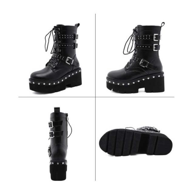 ブーツ 厚底ブーツ ベルト ショートブーツ サイドジップ 8cmヒール レースアップ 黒 ブラック ゴシック靴 スタッズ パンクスタイル 歩きやすい 履きやすい 原宿系 原宿ファッション
