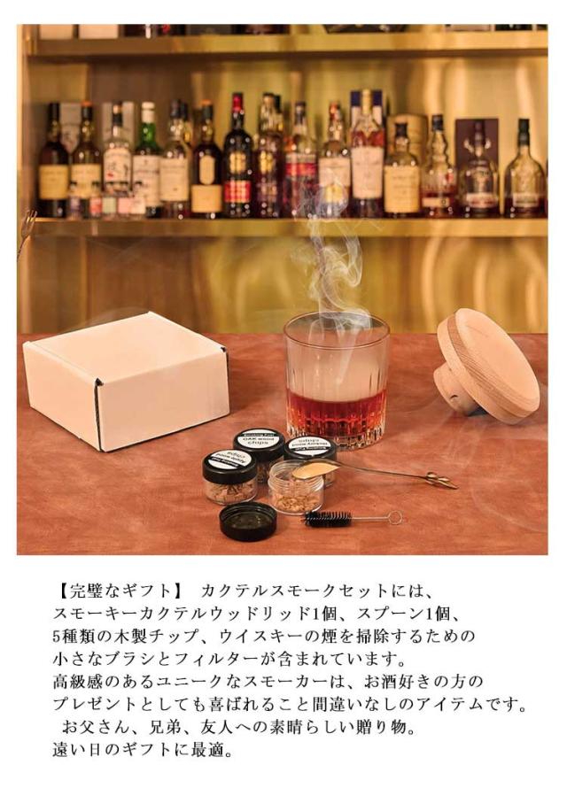 | 【プレミアム素材】天然の化学薬品不使用のウッドチップで、心地よいライトスモーキーフルーティな香りと味。 【プロのようなスモークドリンク】 シンプルでありながらエレガントなデザインは、誰でもプロのバーテンダーになり、ホームバーで友達を驚かせるチャンスを提供します。パーティーに最適で、どんな飲み物にも心地よい香りを提供します。 【グラストップスモーカーの魅力】 燻製は様々なお酒と相性が良く、スピリッツ、カクテル、ビールなどお好みのお酒で楽しめます。当社のスモークカクテルキットには、アップル、チェリー、オーク、ナシ、クルミの5種類の木製チップが含まれています。燻製チップは全5種類あるので、甘味を感じるりんごや、強い香りを楽しめるヒッコリーなど、お酒とチップのベストな組み合わせを探求するのも、このスモーカーの楽しみの一つ。 【使いやすい】使用法は簡単で、好みのお酒をグラスに注いだ後「グラストップスモーカー」を設置するのみ。あとは好みの燻製チップを小さじ半分ほど入れ、トーチで加熱し煙が出てきたら2〜3分ほどで完成。グラスの中に漂うスモークを眺めながら、至高の一杯ができるのを待つのもオツな時間かもしれません。「グラストップスモーカー」を外すと煙が立ち上り、なんとも良い雰囲気です。持ち運びが簡単で、キッチン、バー、ピクニック、釣りなどの屋外での使用に最適です。 【完璧なギフト】 カクテルスモークセットには、スモーキーカクテルウッドリッド1個、スプーン1個、5種類の木製チップ、ウイスキーの煙を掃除するための小さなブラシとフィルターが含まれています。高級感のあるユニークなスモーカーは、お酒好きの方のプレゼントとしても喜ばれること間違いなしのアイテムです。 お父さん、兄弟、友人への素晴らしい贈り物。 遠い日のギフトに最適。 | |