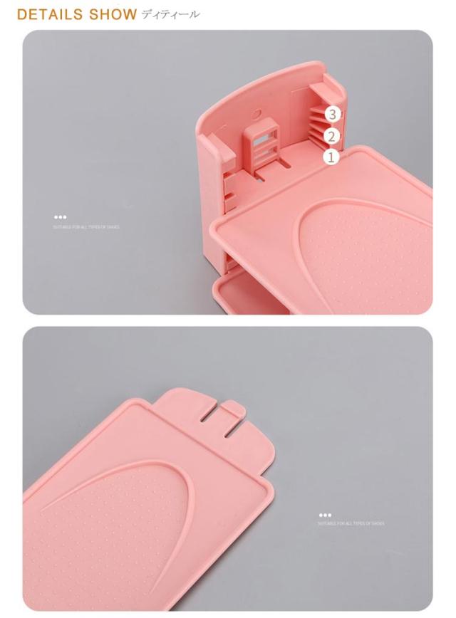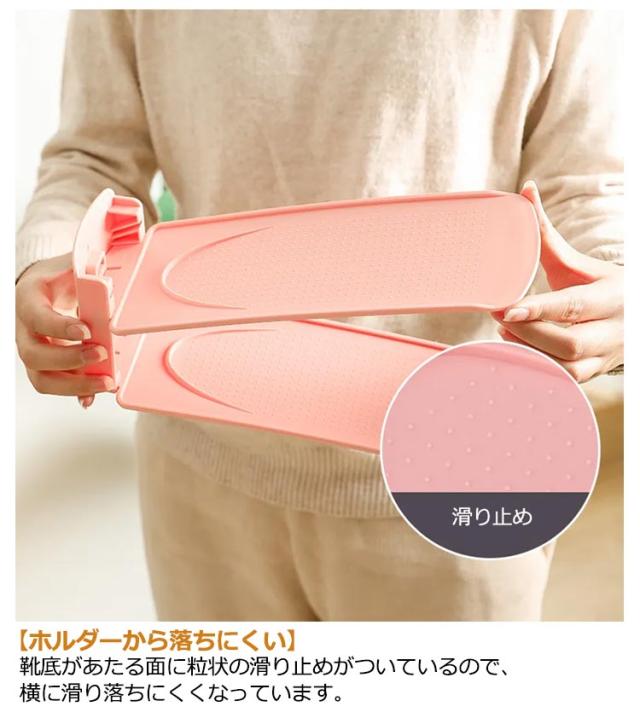 | 【出し入れ簡単】 引き出し穴があるので、片手でサッと引き出せて簡単に出し入れできます。 【ホルダーから落ちにくい】 靴底があたる面に粒状の滑り止めがついているので、横に滑り落ちにくくなっています。 【靴をしっかり支える】 靴のかかとが当たる部分にストッパーが付いているので、靴がずれ落ちる心配がありません。 | |