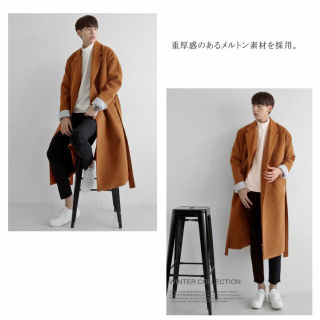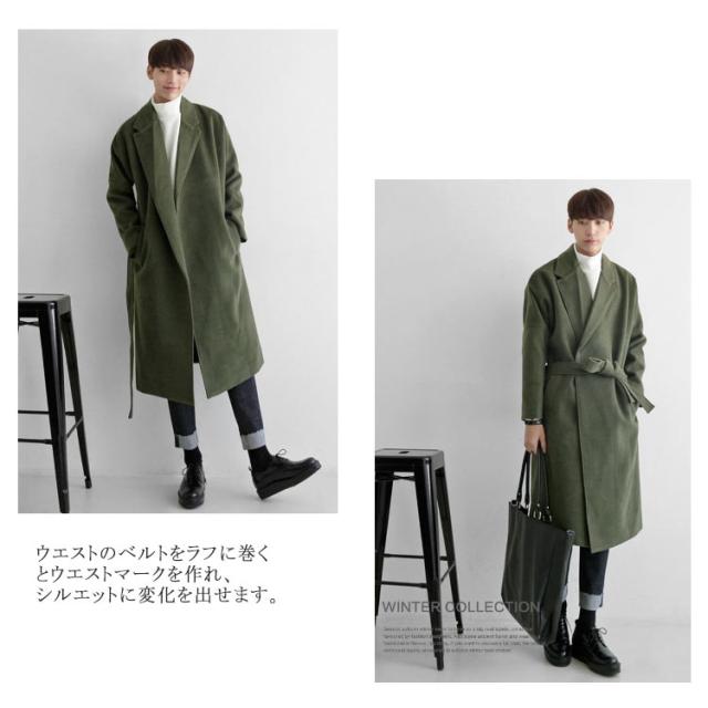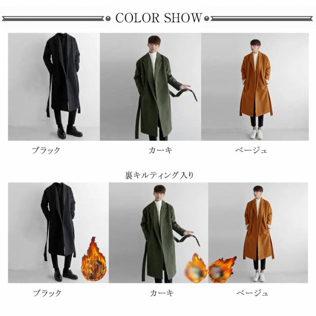 コート メンズ チェスターコート メルトン ロングコート 膝下丈 ベルト付き 秋 冬 キルティング入り 裏キルト 厚手 暖かい 防寒 保温 オーバーサイズ ボタンレス ガウン風 通勤 カジュアル 韓国 ファッション 大きいサイズ ブラック カーキ ベージュ