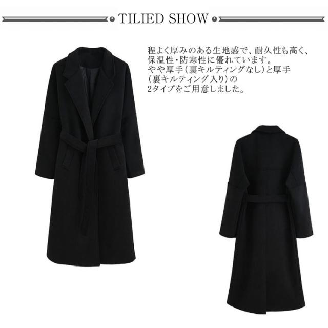| ボタンレスベルト付き、ガウン風の膝下丈チェスターコート。【裏キルティング入り&裏キルティングなし2タイプ】 重厚感のあるメルトン素材を採用。 程よく厚みのある生地感で、耐久性も高く、保温性・防寒性に優れています。やや厚手(裏キルティングなし)と厚手(裏キルティング入り)の2タイプをご用意しました。 オーバーサイズで着丈も長く、ゆったりと着ていただけるのが特徴。 ウエストのベルトをラフに巻くとウエストマークを作れ、シルエットに変化を出せます。 シンプルなデザインに加えゆとりのあるシルエットなので、カットソーやニット、スウェットなどインナーを選ばず様々なコーディネートと合わせていただけます。 | |