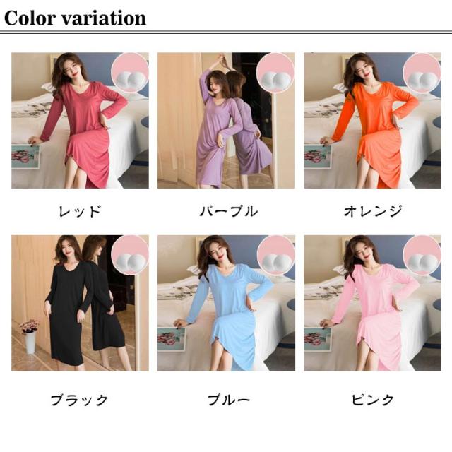 カップ付き ワンピース レディース 長袖 Uネック ボーダー ロング丈 パジャマ ブラカップ付き 秋 冬 春 ワンピース ルームウェア ナイトウェア 寝間着 部屋着 大きいサイズ ランジェリー リラックス シンプル ゆったり 送料無料