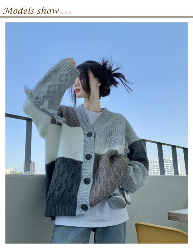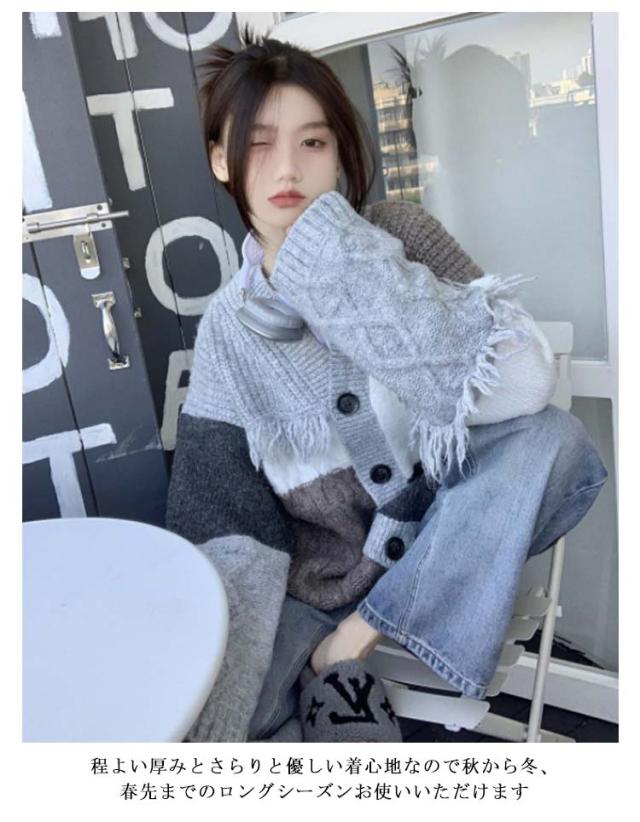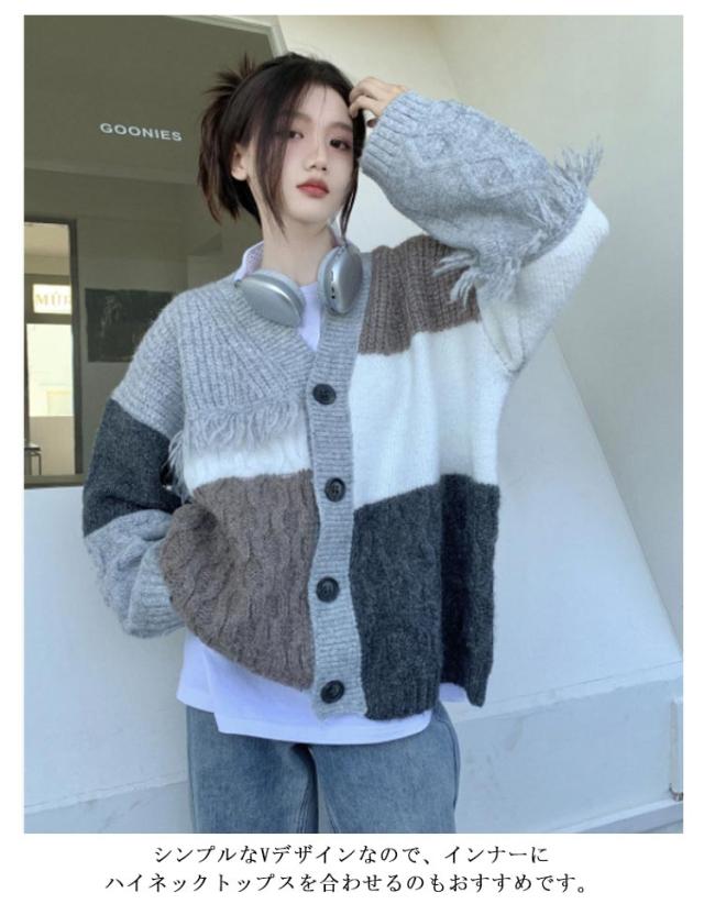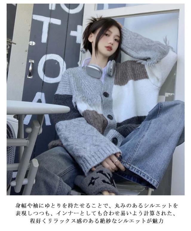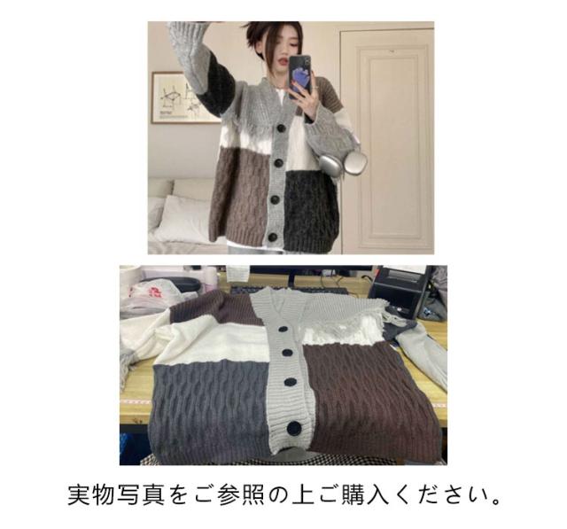 ニット カーディガン 配色 パッチワーク レディース 秋 冬 ニットカーディガン ケーブル編み 厚手 レトロ調 オーバーサイズ ゆったり Vネック ニット カーデ 羽織り アウター 秋服 秋物 あたっか 防寒 個性的 大人 カジュアル おしゃれ 【送無】