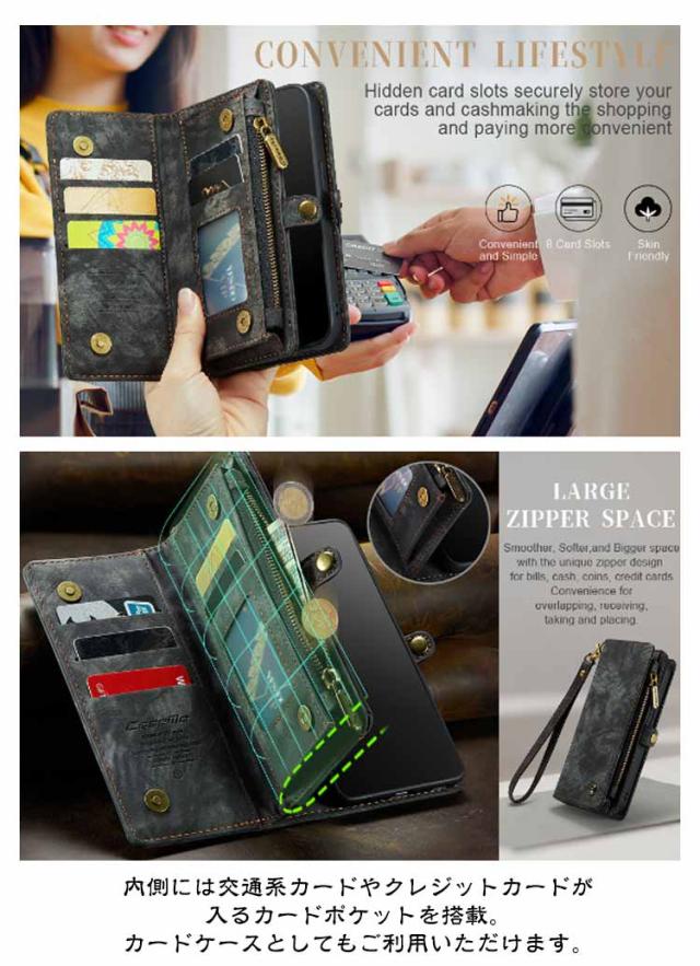 | 【対応機種】iPhone 【素材】PUレザー TPU 【セット内容】スマホケース(iPhone本体は同梱されておりません) 【特徴】 インナーケースは、本体とマグネット分離式になっているため、通話や撮影などのご使用時には簡単に取り外します。 たっぷり収納できる手帳型ケースが登場しました。 内側には交通系カードやクレジットカードが入るカードポケットを搭載。カードケースとしてもご利用いただけます。 それに、小銭やカギ、名刺などを収納できるジッパー付きポケットを用意。 お出かけ際に、これだけを持っていけば十分! インナーケースをつけたままのワイヤレス充電も可能です。 スマホを横置きできるスタンド機能で長時間の動画視聴もらくらく!新幹線、飛行機の中での暇つぶしに最適です。 上品な質感のPUレザーを使用し、触り心地や耐久性も抜群。 カメラレンズ周囲の穴に段差を設けることによって、iPhoneの突出したレンズを保護。 通勤通学時に便利、合計8ヵ所のカードポケット付き。 ケースと同じ色のハンドストラップも付属。ストラップの取り付けがやすく、お気に入りストラップの変更も可能です。 | |