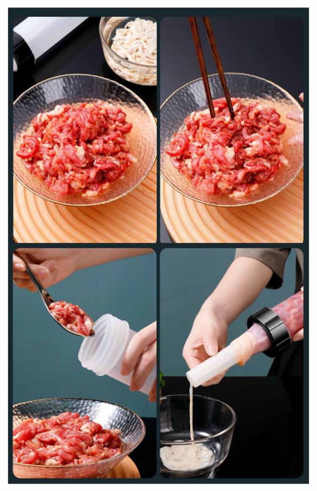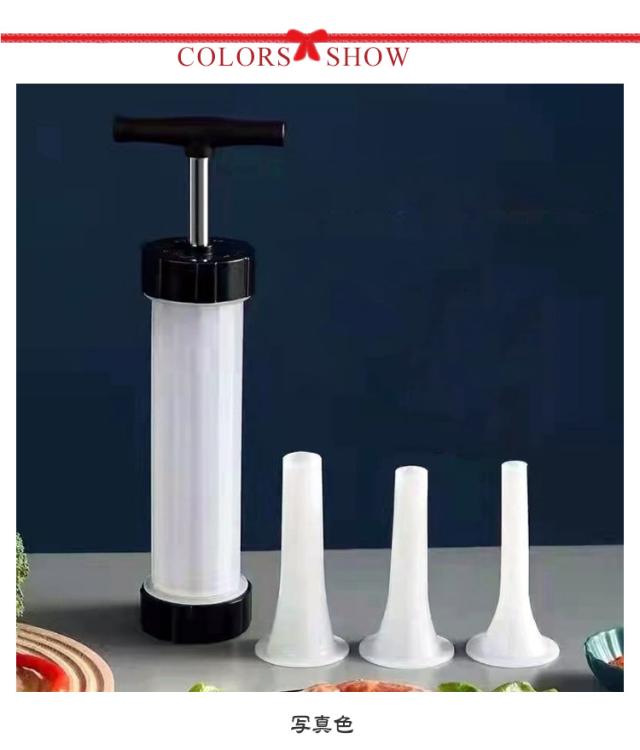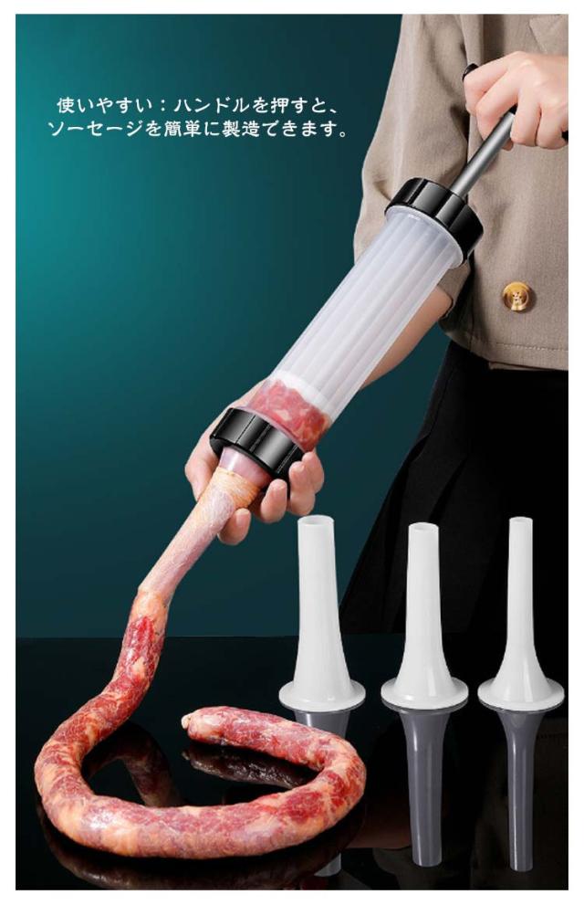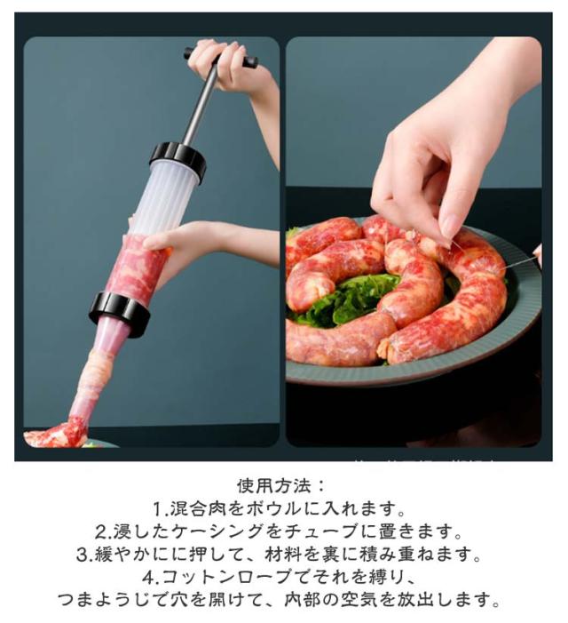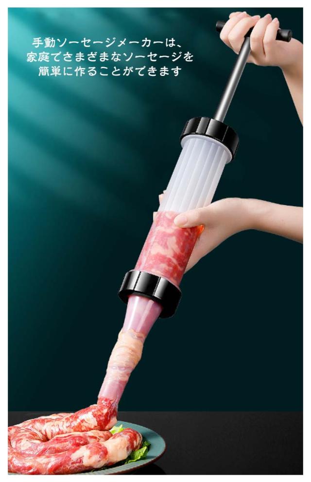 | 【手動ソーセージメーカー】【操作簡単】【3つのノズル付き】 手動ソーセージメーカーは、家庭でさまざまなソーセージを簡単に作ることができます 3つ違いサイズのノズル付きで、ソーセージ、ホットドッグ、ブラートヴルストなどを作るのに最適です。 完全に取り外し可能なデザインは、使用するたびに簡単に掃除できます。 使いやすい:ハンドルを押すと、ソーセージを簡単に製造できます。 使用方法: 1.混合肉をボウルに入れます。 2.浸したケーシングをチューブに置きます。 3.緩やかにに押して、材料を裏に積み重ねます。 4.コットンロープでそれを縛り、つまようじで穴を開けて、内部の空気を放出します。 | |