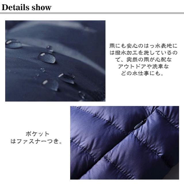 | 軽くて暖かい ダウンジャケット 軽量・撥水・防風 高品質ダウンで、軽くて暖か高品質なダウンは多くの空気を含むので、軽量で保温性が高く着心地も抜群です。 着ているのを忘れるくらいの着心地です。 雨にも安心のはっ水表地には撥水加工を施しているので、突然の雨が心配なアウトドアや洗車などの水仕事にも。 小さく持ち歩ける収納袋つき。 ポケットはファスナーつき。 | |