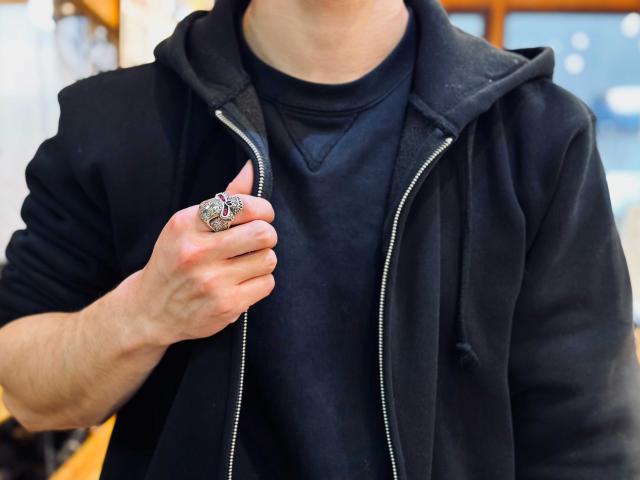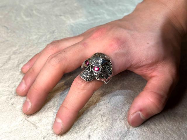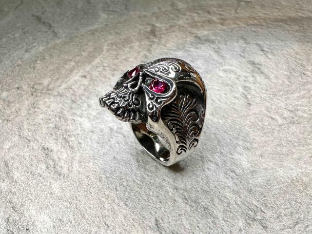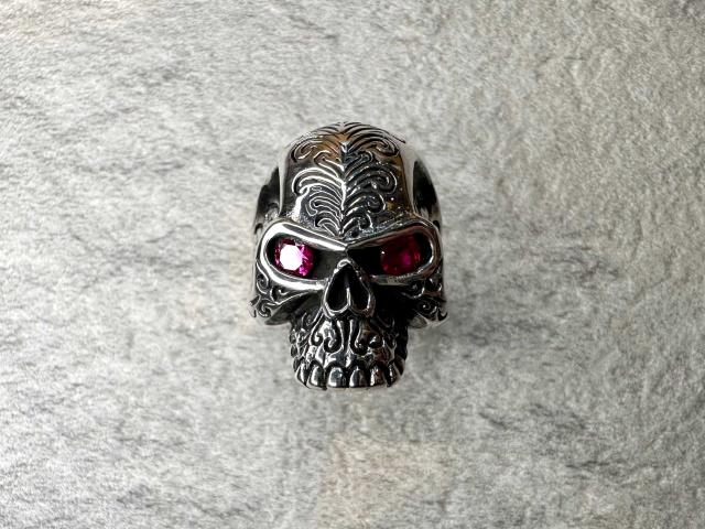 目の部分にシンセティックルビーをセットしたスカルリング。