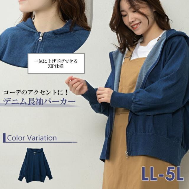 大きいサイズ レディース デニムパーカー 長袖 ジップアップ フーディー 裏毛 ライトアウター LL/3L/4L/5L ゆったりサイズ ぽっちゃり女子 プラスサイズ