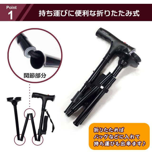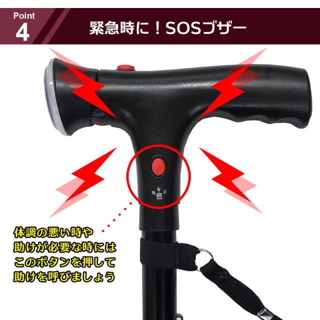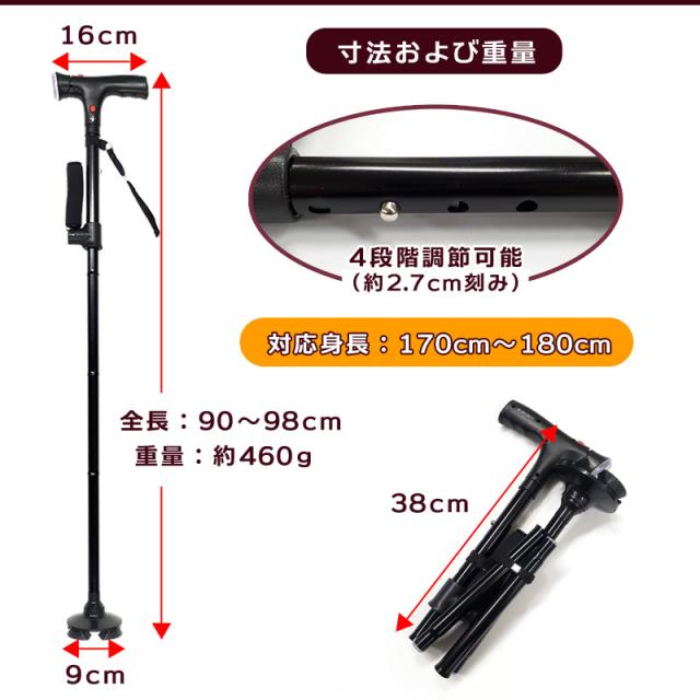 杖 つえ ステッキ 折りたたみ 折り畳み 軽量 伸縮式 自立杖 自立式 LEDライト付き 光る杖 四つ足 4点足4本足 スタンド置き 立ち上がり補助ハンドル付き 取っ手 高身長 長い 長め 女性 男性 高齢者 老人 介護 警報ブザー付き 長さ調節可能 高さ90cm〜98cm 黒ブラック