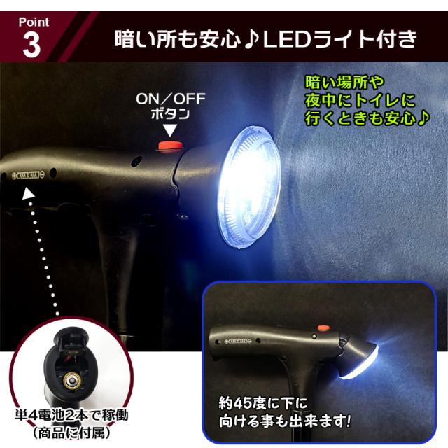 単4電池を2個使用することで、LEDライトおよび警報ブザーの使用が可能になります。