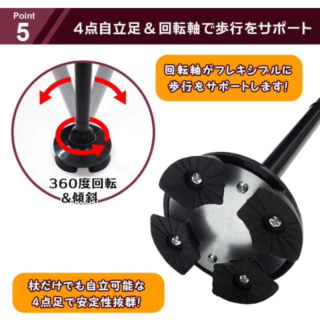 杖の先端は、4点足・4点式の自立式、360度回転します。
