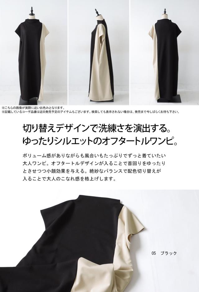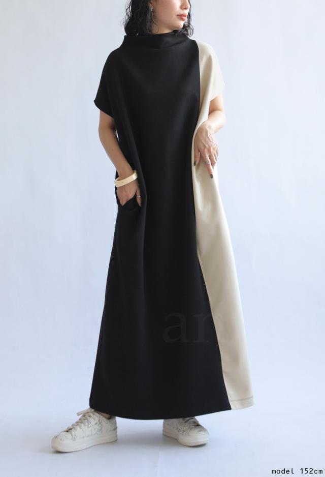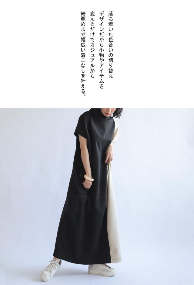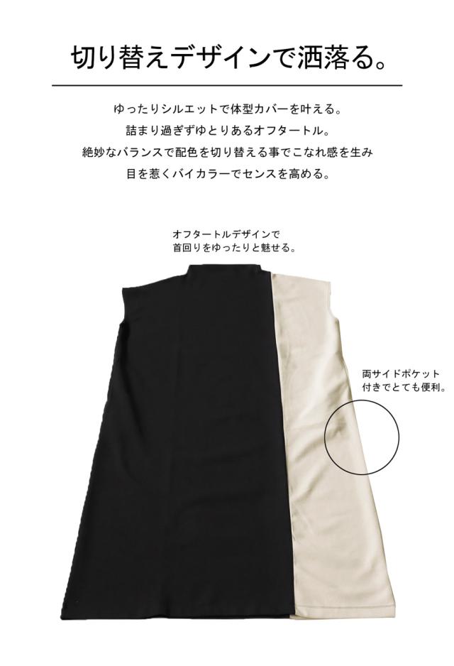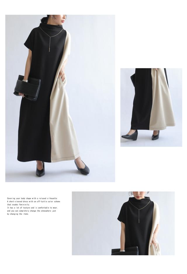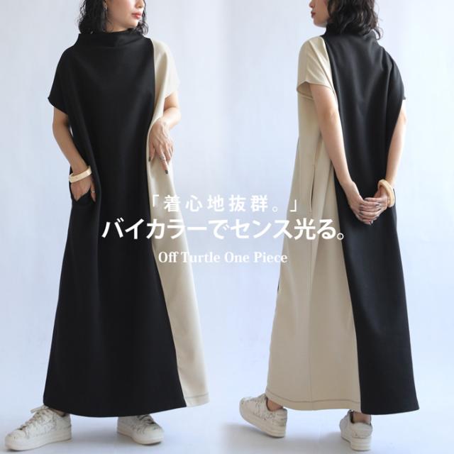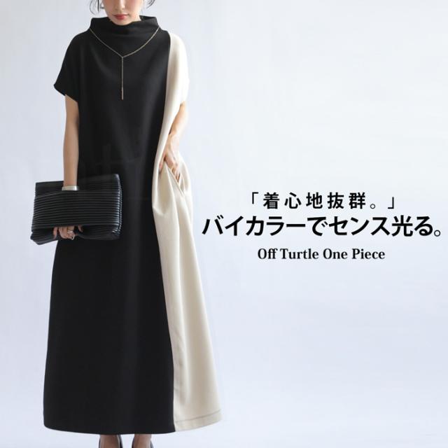 pn-00448 ゆったり シンプル きれいめ 上品 高級感 ロングワンピ ワンピ バイカラー オフタートル ボリューム 伸縮 着痩せ 体型カバー 大きいサイズ 楽ちん ラフ