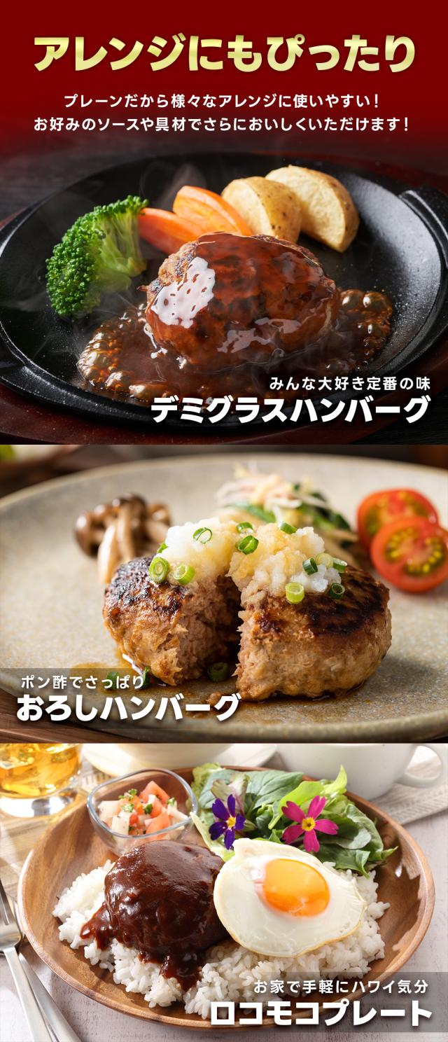 | 原材料名 | 牛肉(アメリカ産・オーストラリア産)、豚肉、ソテーオニオン、つなぎ(パン粉、卵白、牛乳)、牛脂、トマトケチャップ、酵母系調味料、食塩、胡椒/乳化剤、増粘剤(アルギン酸エステル)、V.C、(一部に小麦・卵・乳成分・大豆・牛肉・豚肉を含む) |