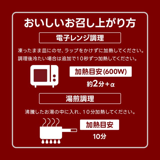 | 調理方法 | 凍ったまま皿にのせ、ラップをかけずに加熱してください。調理後冷たい場合は追加で10秒ずつ加熱してください。 |