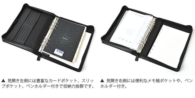 | 仕様 | 見開き左:カードポケット×10、スリップポケット、伸縮性ペンホルダー 見開き右:メモ帳ポケット、伸縮性ペンホルダー |