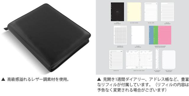 | セット内容 | 年号無し年間スケジュール、定規/ページマーカー、To Doリスト、アドレス帳、インデックス、メモ用紙 ※セット内容はリストや商品画像と異なることがあります。 ※市販のリフィルもご利用頂けます。 |