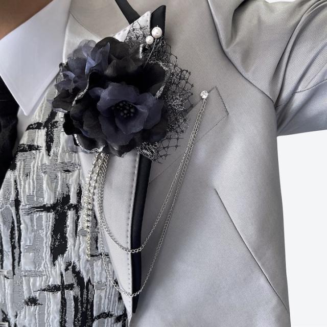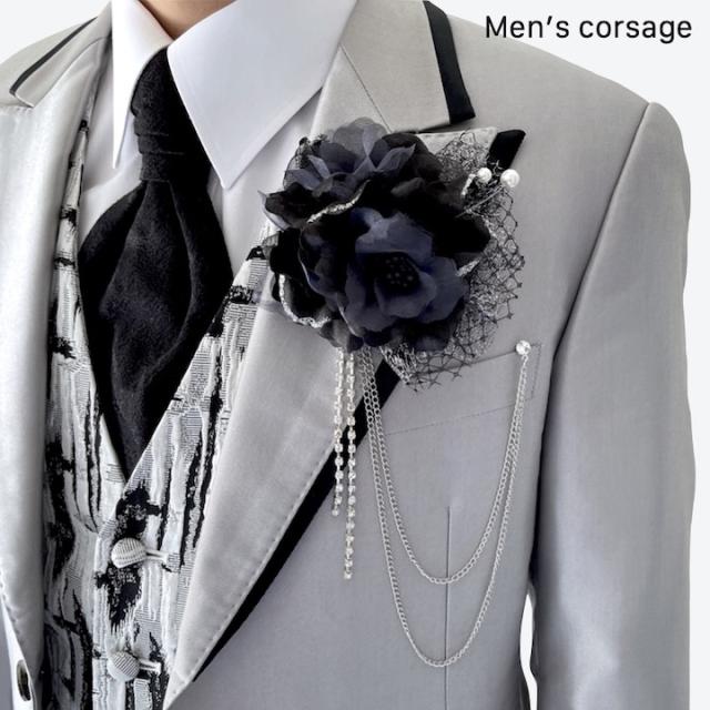 コサージュ メンズ ブラック 黒 ストーン チェーン コサージュ ブローチ ラペルピン 結婚式 披露宴 フォーマル スーツ タキシード かっこいい お洒落 男 メンズ アクセサリー 男性用 花 高級感 ブライダル ホスト 発表会 パーティー 新郎 父 司会 進行役 衣装 衣裳