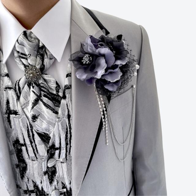 メンズコサージュは、エレガントスタイルとの相性抜群。結婚式スーツ、パーティースーツ、ホストスーツ、イベント衣装など、幅広くお使いいただけます。