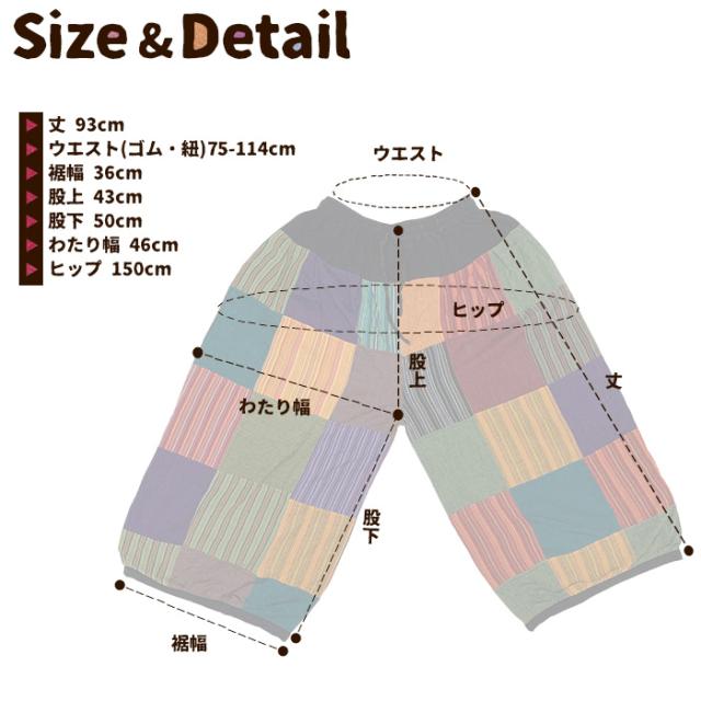 丈93cm ウエスト(ゴム、紐)75-114cm 裾幅36cm ヒップ150cm 股上43cm 股下50cm わたり幅46cm