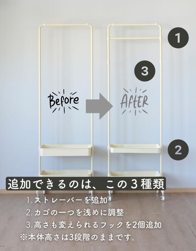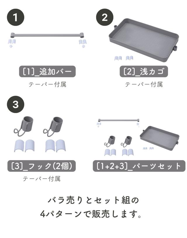 | 商品説明 | ●従来のトローリーハンガーをさらに使いやすくできる、オプションパーツ ※従来品に入れ替えても、追加しても、全体耐荷重(1台あたり60kg)の範囲でお使いください。 ※従来品に本体高さは従来品3段階のままとなります。 ※【色味について】お手元の本体と比較して、製造ロット差による色誤差が起こる可能性がございます。 ●ハンガーバー内寸: 幅53.5cm ●耐荷重: 15kg ●2.5cm間隔で高さ調整可能 ●テーパー付属 ●支柱用キャップも付属 |