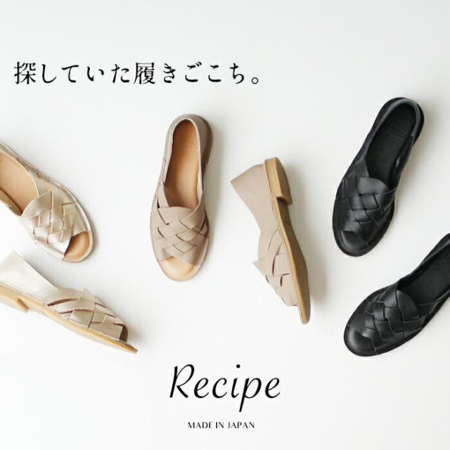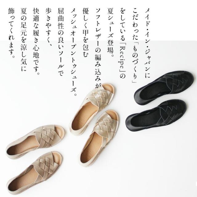 サンダル レディース ぺたんこ 歩きやすい 本革 メッシュ オープントゥ シューズ Recipe / 日本製 40代 50代 60代 30代 女性 スリッポン レザーサンダル レザーシューズ 夏 柔らかい 革靴 2E相当 牛革 フラットシューズ 歩きやすい 黒 ブラック ゴールド 金 グレージュ ベージュ