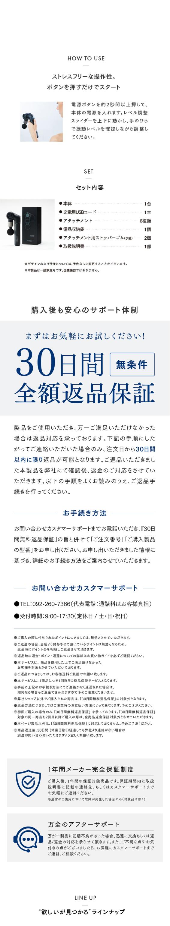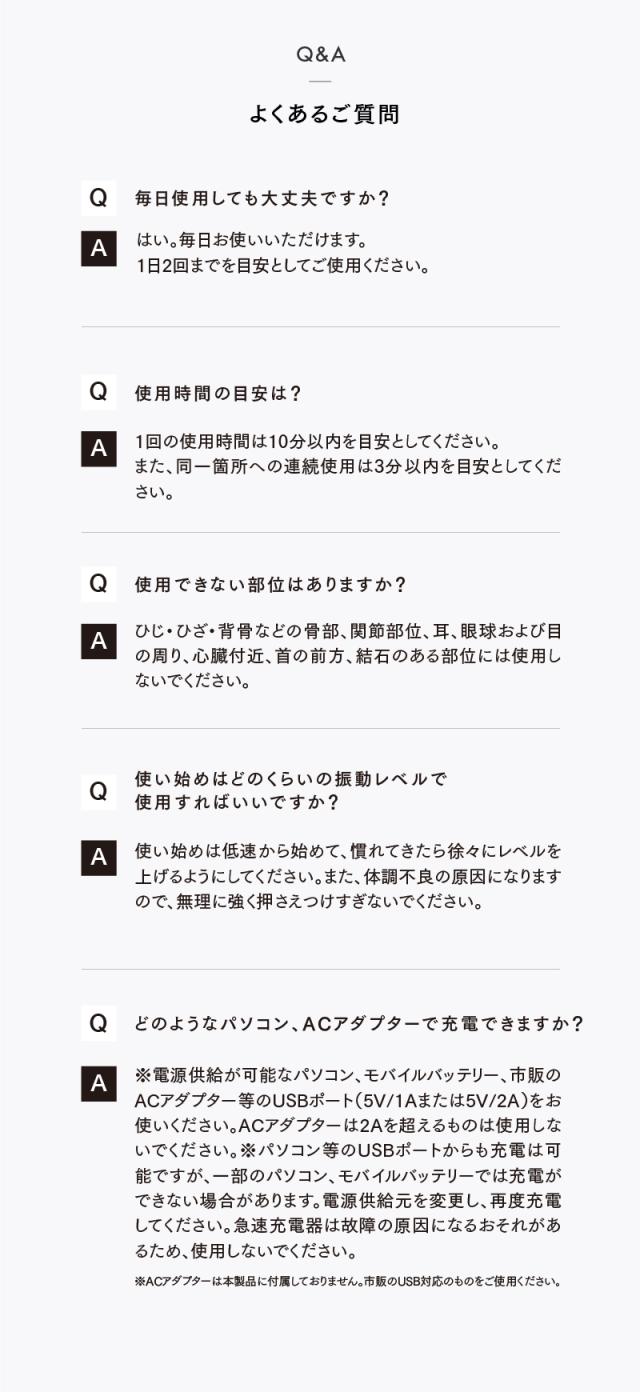| ●素材 | 本体:PC-GF20、ABS樹脂、アルミニウム合金、アクリル、ステンレス、シリコンアタッチメント:ABS樹脂、シリコン、(温熱アタッチメントのみ次を含む:アルミニウム) |