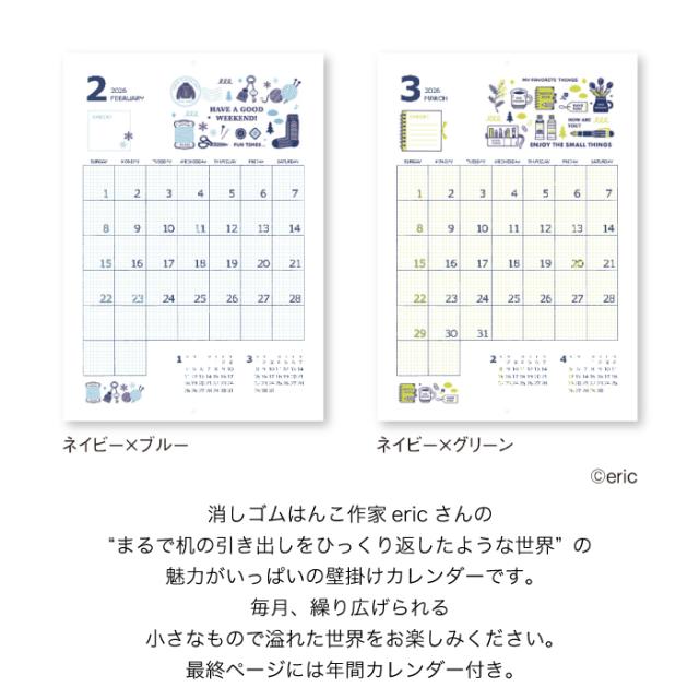 | 商品特徴 | 消しゴムはんこ作家ericさんの描く、小さなもので溢れた世界を楽しもう。 ・“まるで机の引き出しをひっくり返したような世界”の魅力がいっぱいの壁掛けカレンダーです。 ・毎月、繰り広げられる小さなもので溢れた世界をお楽しみください。 ・最終ページには年間カレンダー付き。 |