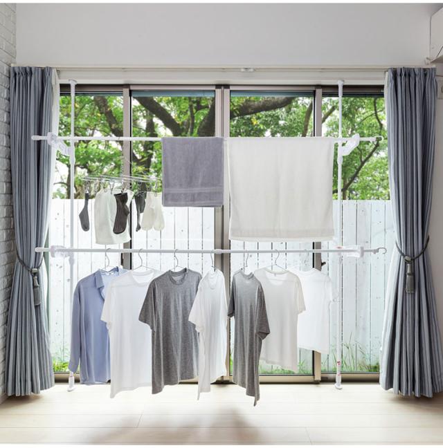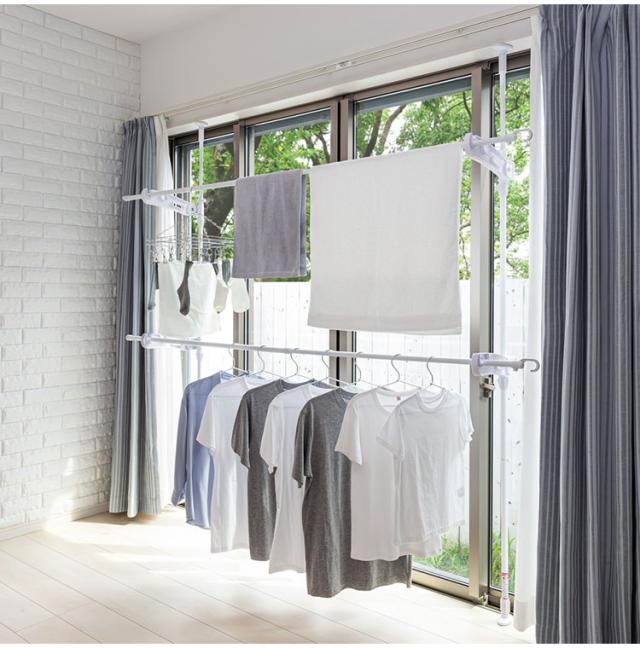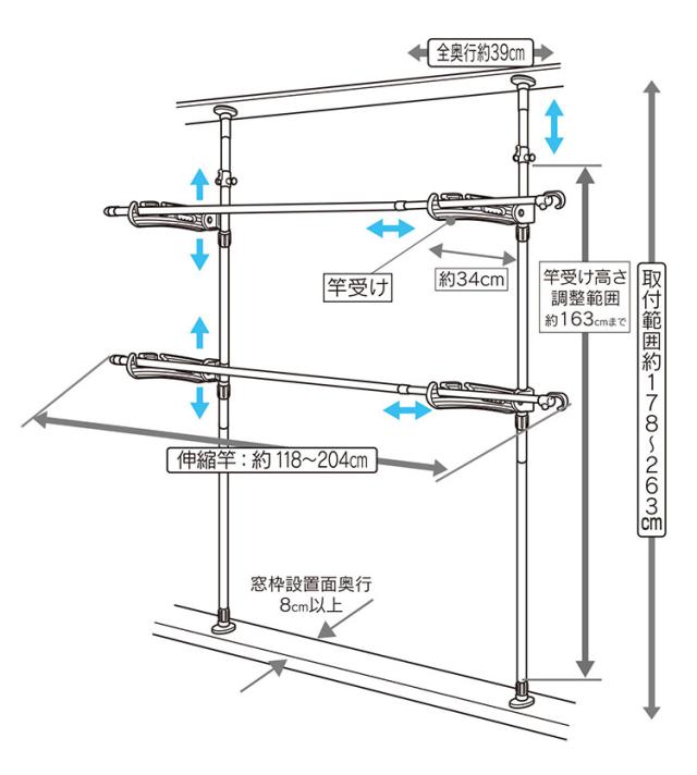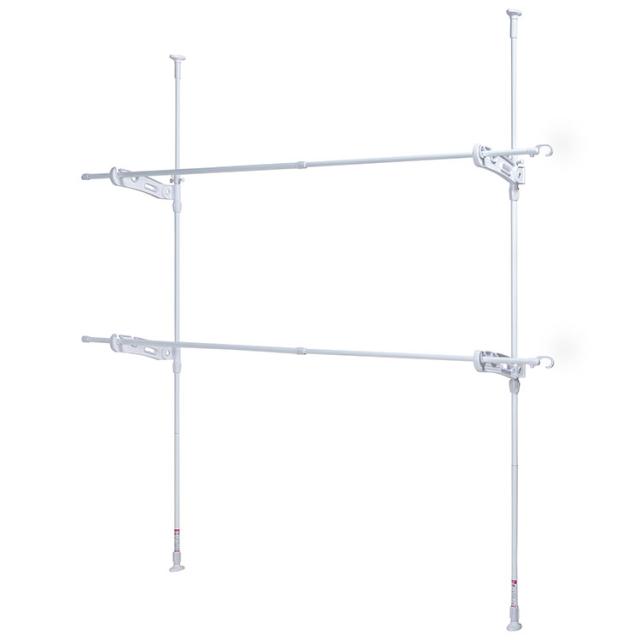 専用の伸縮竿2本付き、上下2段にたっぷり干せます。