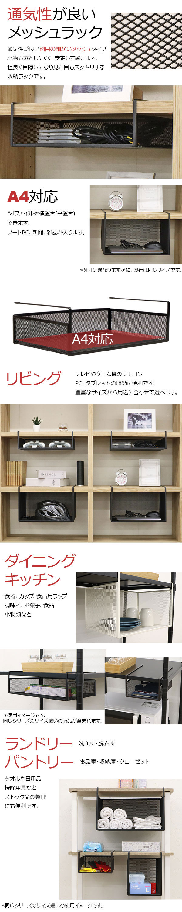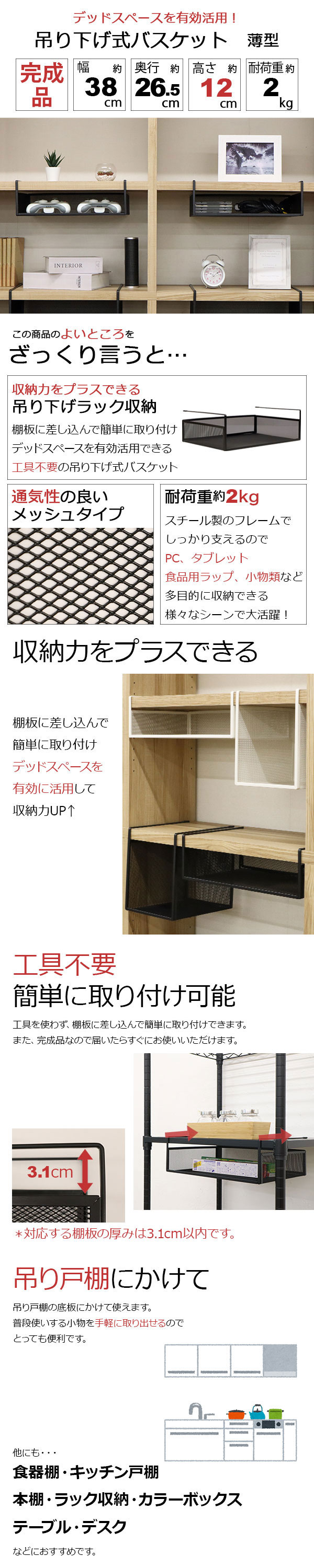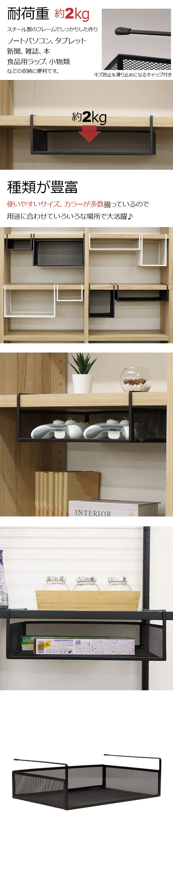 吊り式バスケット 空いた空間スペースを有効活用 毎日使う物などを手軽に取り出せる インテリア シンプル ネジや釘を使わない 棚板に挟むだけ 差し込み式 キズに強い 汚れに強い 中身がわかりやすい 小物収納 清掃用品 ストック収納