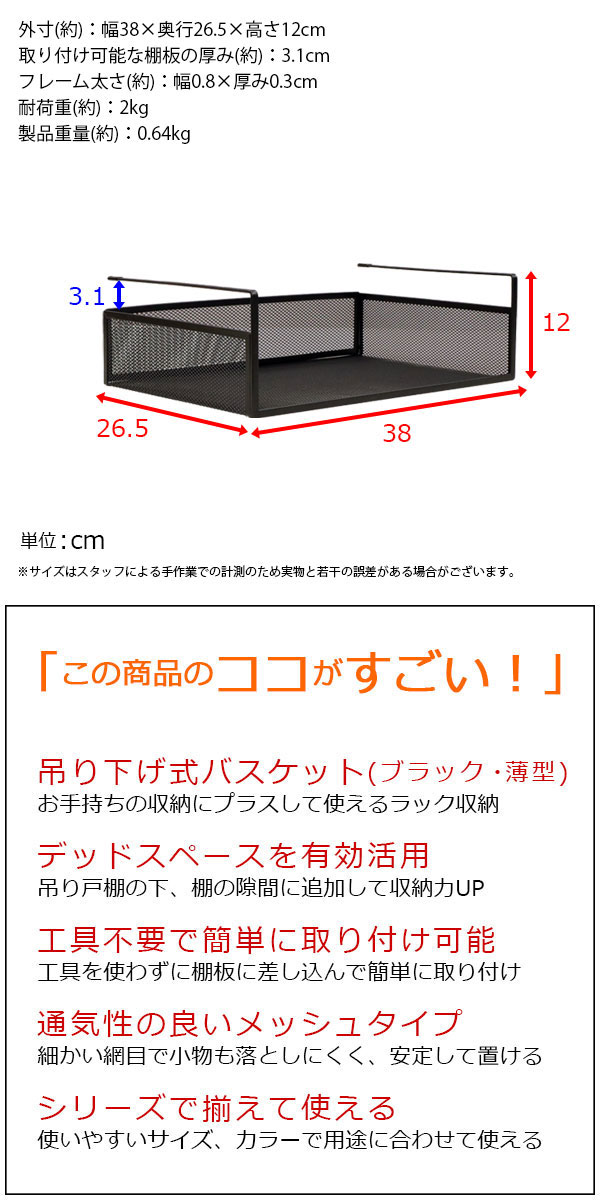 商品名:引っ掛ける 収納 ラック 2個セット 頑丈 吊り下げラック 吊り戸棚下 収納ラック A4対応 キッチン 棚板下収納ラック ぶら下げるカゴ 棚の下 メッシュバスケット 幅38cm 奥行26.5cm 高さ12cm(収納高さ約8cm) ハンギングラック 引っ掛けラック 引っ掛け収納 ブラック黒 完成品 スチール 耐荷重2kg 耐久性 おしゃれ かわいい お洒落 可愛い リビング パソコン周り PC周辺機器 ファイル 小物類 タオル 掃除用具
