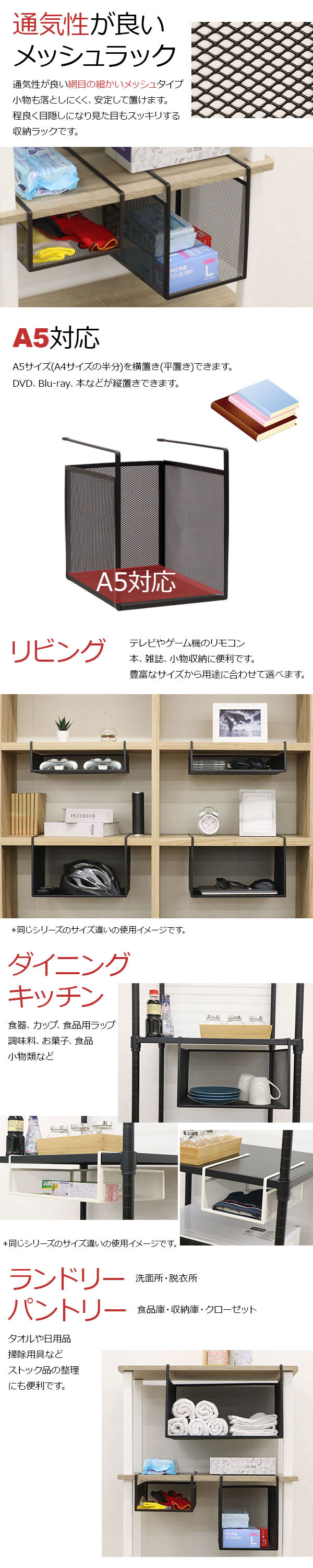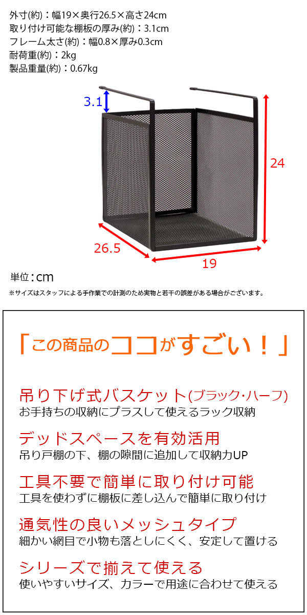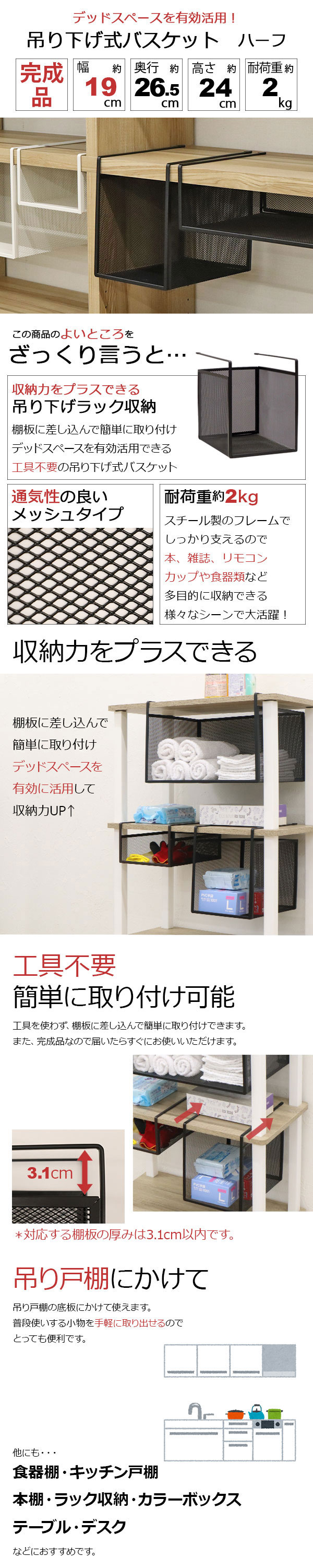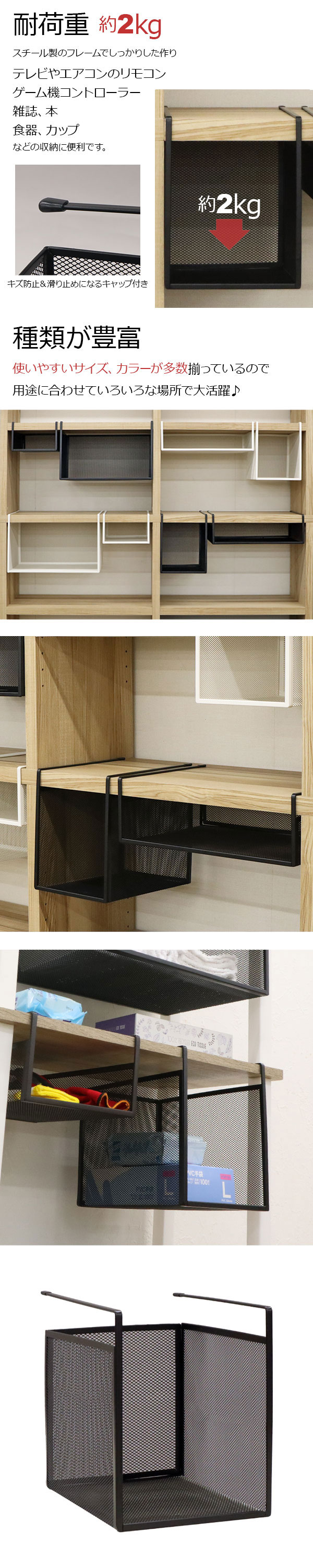 吊り式バスケット 空いた空間スペースを有効活用 毎日使う物などを手軽に取り出せる インテリア シンプル ネジや釘を使わない 棚板に挟むだけ 差し込み式 キズに強い 汚れに強い 中身がわかりやすい 小物収納 清掃用品 ストック収納
