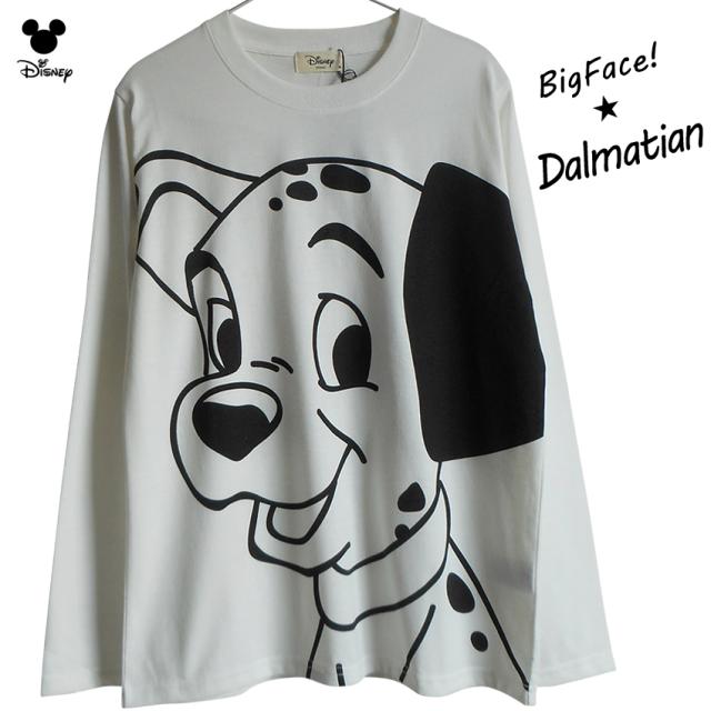送料無料 101匹わんちゃん ディズニー 長袖Tシャツ ロンT カットソー ビッグフェイス BIGフェイス ナチュラル ダルメシアン 101匹ワンちゃん スマイル disney レディース シンプル レトロ ペアルック 男女兼用 かわいい 白 モノトーン 大人 TDL 春 秋