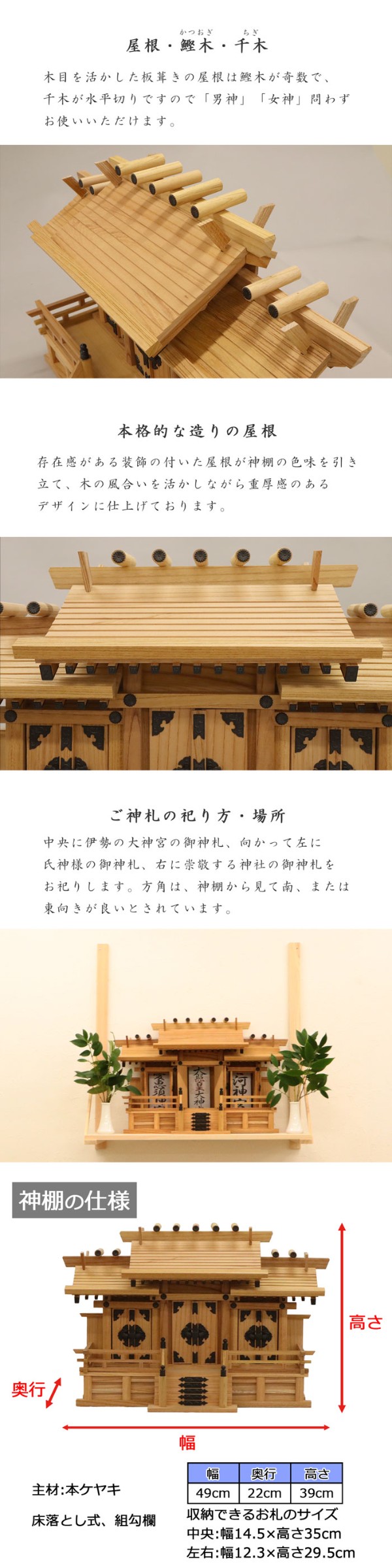 神棚 三社 完成品 日本製 国産 中 おしゃれ お札 御札立て 本ケヤキ 天然木 幅62.5cm 奥行24.5cm 高さ41.1cm お札立て 神札 御神札 神棚 屋根違い三社 本けやき 本欅 三社造り おふだ立て おふだたて お札差し シンプル モダン リビング 家庭用 お守り お札 お供え 伝統的