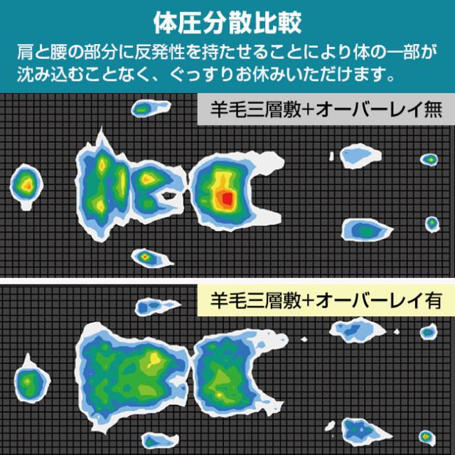 寝た時の正しい姿勢は肩や腰が沈み込まず、真っすぐ水平な状態が良いと言われています。肩と腰の部分に反発性を持たせることにより体の一部が沈み込むことなく、ぐっすりお休みいただけます。
