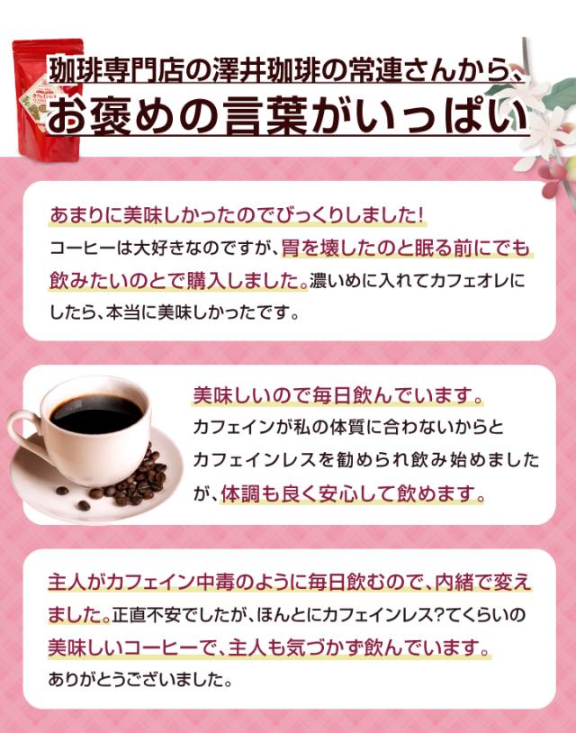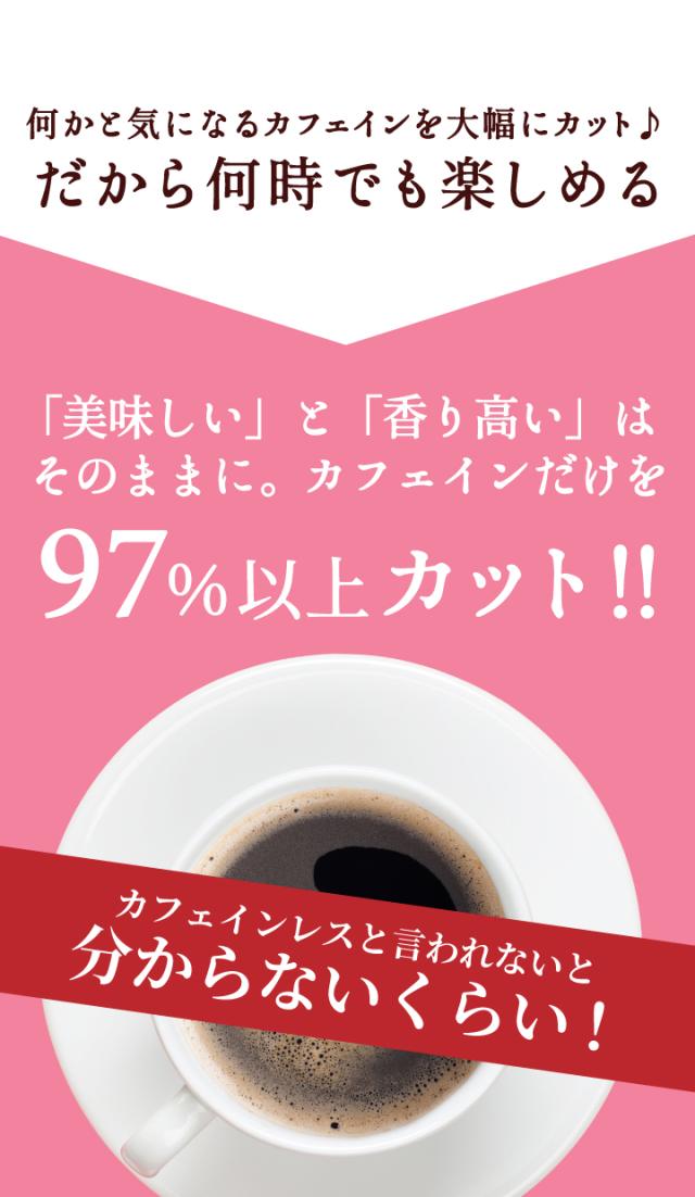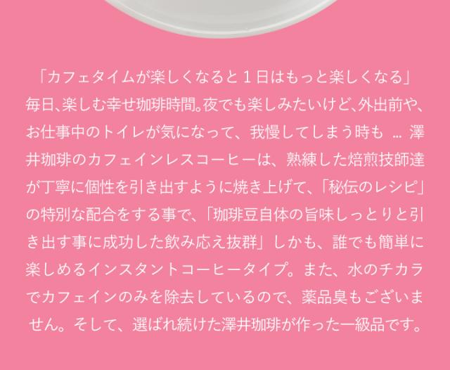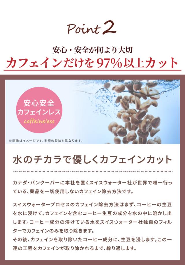 | カフェインを気にせずに毎日楽しめる、香り高く、簡単に作れるインスタントコーヒーです。カフェインを97%以上カットし、どんな世代にも簡単で安全なコーヒータイムを提供します。 カフェインを気にせず安全に楽しめる カフェインを97%以上カットしているので、夜でも安心して飲むことができます。 カナダのスイスウォーター社が開発した特別な方法で、薬品を使わずにカフェインを取り除いています。 カフェインの刺激を気にせずに、どんな時間帯でもコーヒーを楽しめます。 香りと風味が保ち続けられる 香りを楽しむコーヒーだからこそ、湿気対策が非常に重要であり、約40杯分を10袋に小分けしてお届けします。 さらに、チャック式の袋を採用しているため、封を開けた後も湿気からしっかりと守ります。 これにより、いつでも新鮮な香りと風味を楽しんでいただくことが可能です。 簡単に作れてどんな世代にも優しい お湯で溶かすだけで簡単に作れるので、子供からお年寄りまでどんな世代の人でも手軽に楽しめます。 カフェインの刺激が少ないため、健康を気にする人や夜間のコーヒータイムを楽しみたい人にぴったりです。 | |