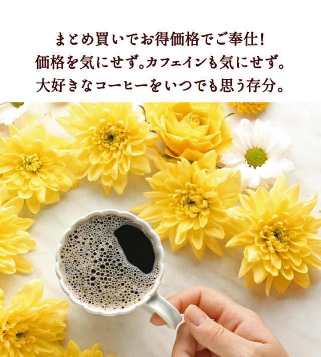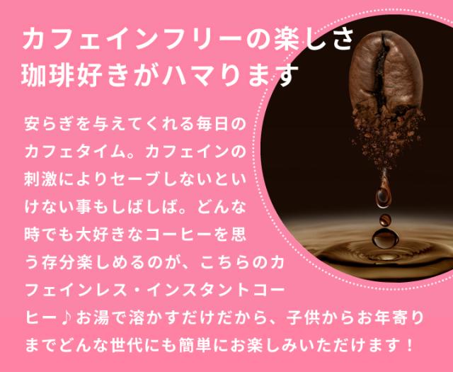 | こんな方にオススメです | 簡単に珈琲を楽しみたい方: お湯で溶かすだけなので、手間がかからずどんな世代にもお楽しみいただけます。 カフェインなしで飲みたい方: 夜や妊娠中・妊婦の方でも安全にお楽しみいただけます。 家族やオフィスで飲む方:大容量のパッケージなので、みんなで楽しめます。 |