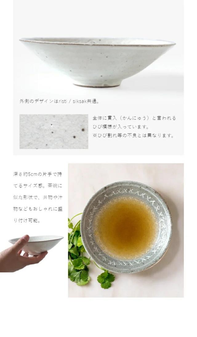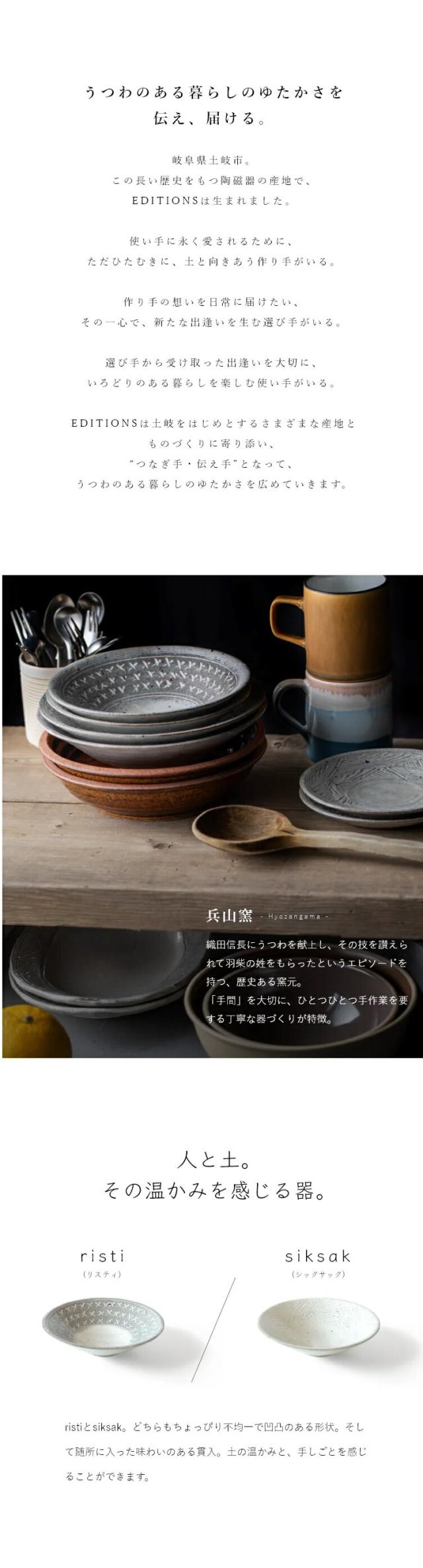 兵山窯が手掛ける美濃焼きのまる皿は、フィンランド語で「クロス」を意味する「risti」と「ジグザグ」を表す「siksak」という名前が付けられています。