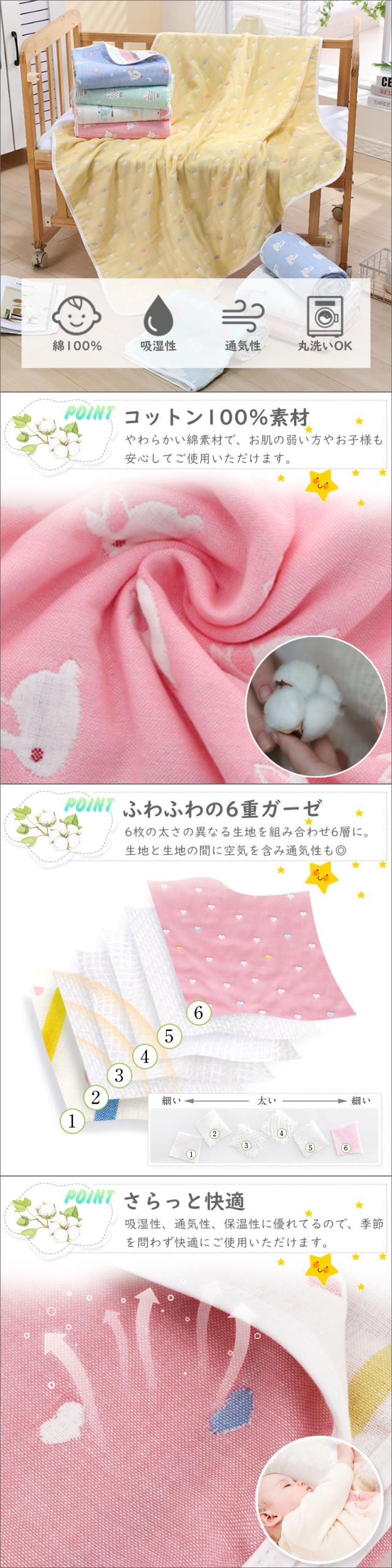 | 商品 特徴 | 【コットン100%素材】 やわらかい綿素材で、お肌の弱い方やお子様もあんしんして ご使用いただけます。 【ふわふわの6重ガーゼ】 6枚の太さの異なる生地を組み合わせ6層に。生地と生地の間に空気を含み通気性もよいです。 【さらっと快適】 吸湿性、通気性、保温性に優れているので、季節問わず快適にご使用いただけます。 【どちらも使える】 両面かわいいリバーシブルデザインで、気分のよって使い分けていただけます。 【洗うほどふんわり】 洗濯をするとどんどん肌触りがよくなるので、お家でふわふわに育てていただけます。 【しっかり縫いで安心】 ダブルステッチでしっかりと縫製されているので、繰り返しのお洗濯でほつれにくく安心です。 |