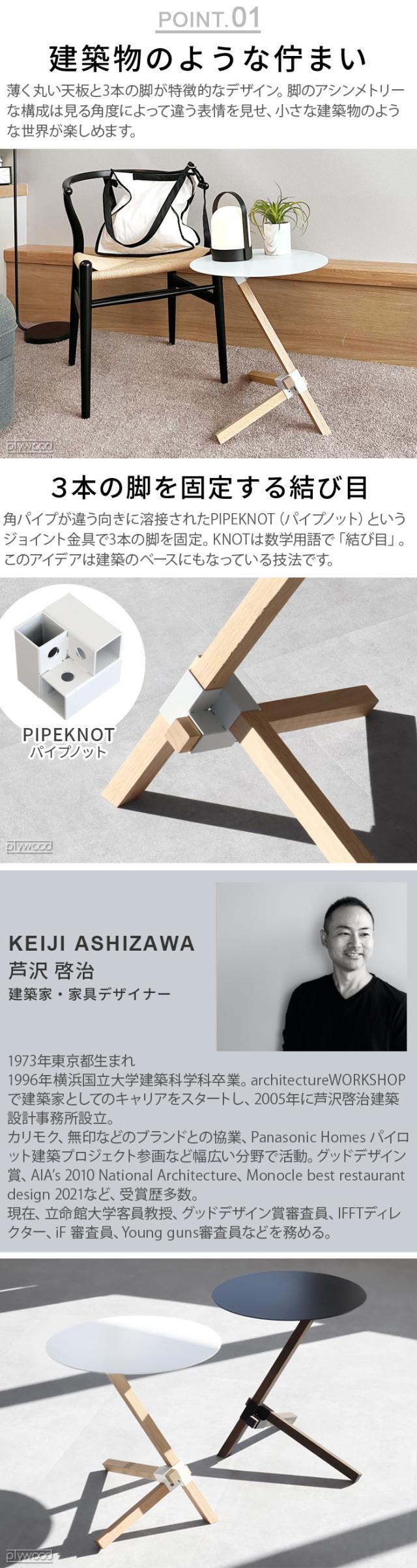 TRE SIDE TABLE(トレ サイド テーブル)はスチール製の薄く丸い天板と、3本のオーク材の脚の組み合わせが特徴的。足のアシンメトリーな組みは見る角度によって全く違う表情を見せ、アーキテクトな構造でまさに小さな建築物のような世界が楽しめるサイドテーブルです。リビングのソファサイド、カフェテーブル、ベッドの横など様々なシーンにマッチします。