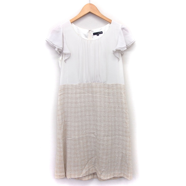【中古】エニィファム anyFam ワンピース 膝丈 切替 シフォン ツイード 半袖 丸首 3 綿混 アイボリー 白 ベージュ