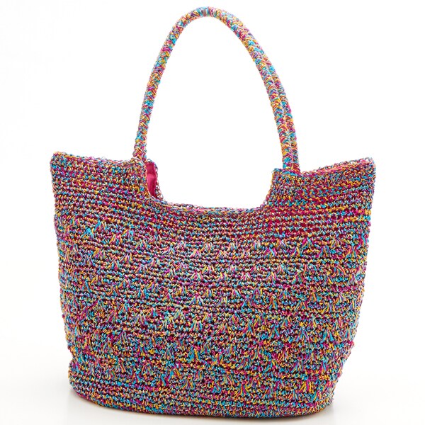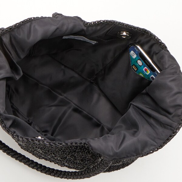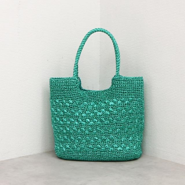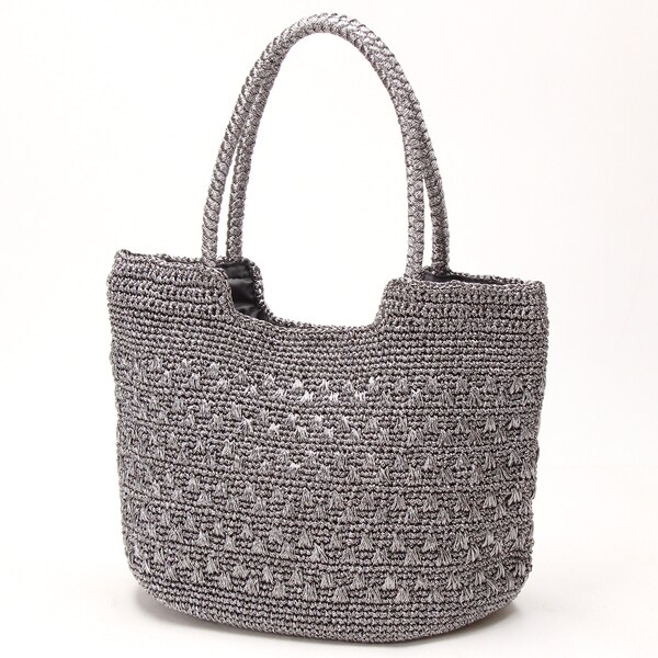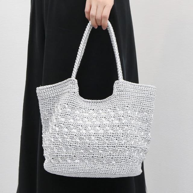メタリックヤーンを編み込んだトートバッグ。
