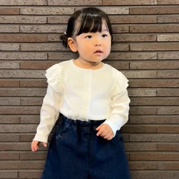 肩のフリルが程良い甘さで、女の子らしい優しい印象に仕上げています。
