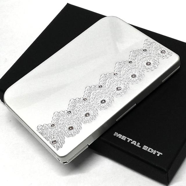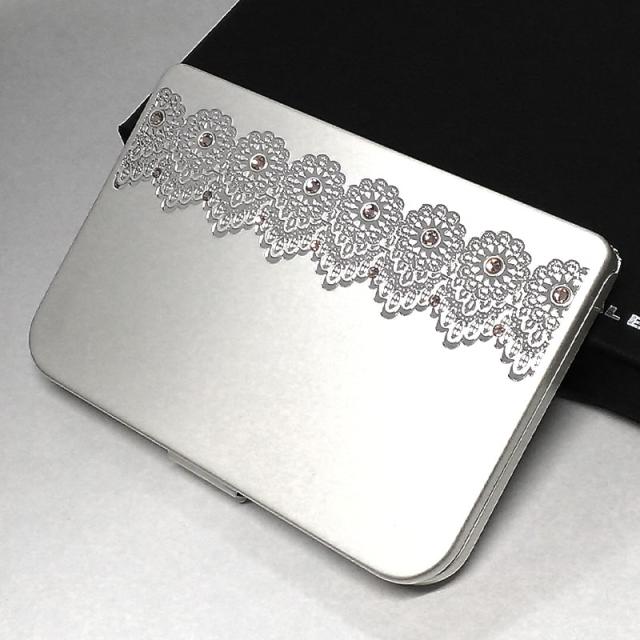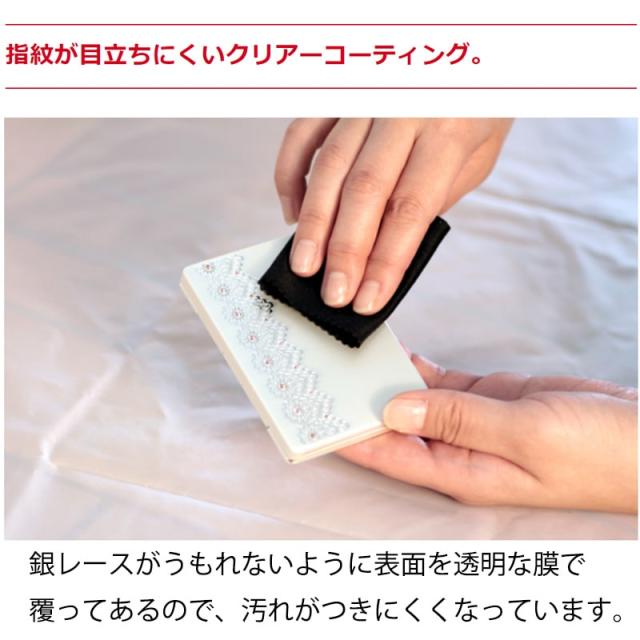 金属素材そのままだと、どうしても使ううちに指紋の跡がつきやすくなるものですが、このカードケースは銀レースがうもれないように表面を透明な膜で覆ってあるので、汚れもつきにくくなっています。