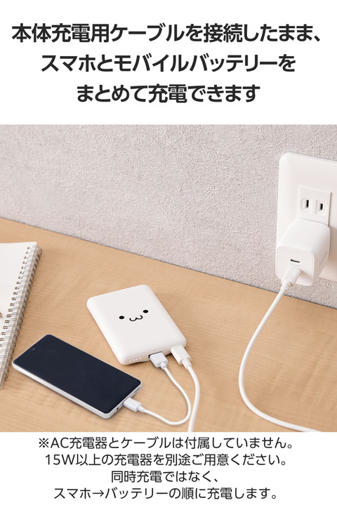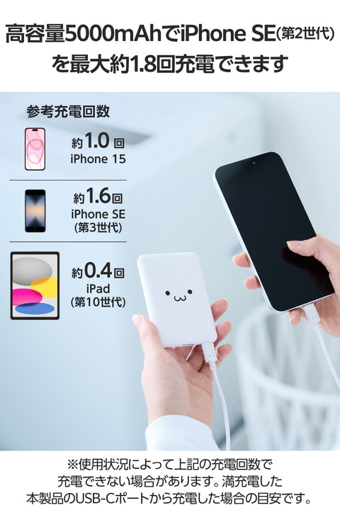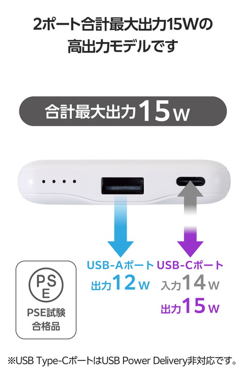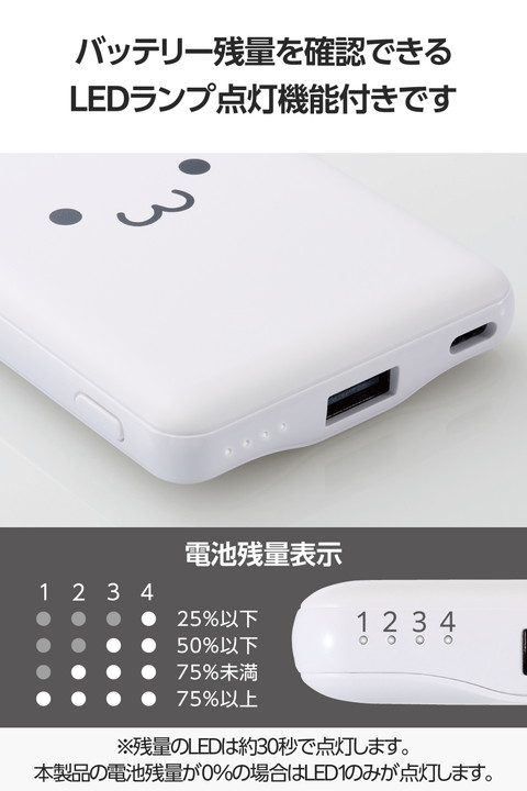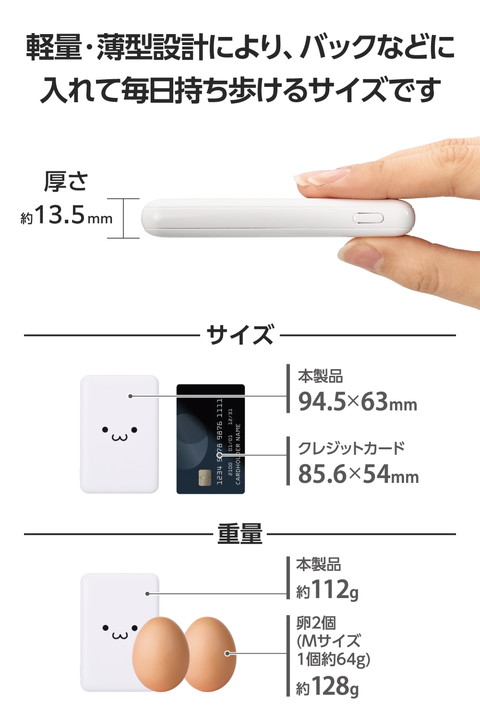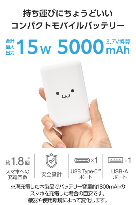小さなバッグやポケットに入れても気にならない、薄型・コンパクトタイプのモバイルバッテリーです。約112gと軽量ながら容量は5000mAh。持ち運びにちょうどいいサイズです。![]() ■小さくて軽く、持ち運びにちょうどいい、15W出力、容量5000mAhのコンパクトなモバイルバッテリーです。 ■厚さ約13.5mmの薄型モデルで、バッグに入れて毎日持ち歩けるサイズです。 ■USBポートに搭載した高性能ICが、接続機器を自動で見分けて最適な出力で最速に充電できる“おまかせ充電”に対応しています。 ■モバイルバッテリー本体を約2時間40分で充電できます。 ■※5V/2.4AのAC充電器にUSB Type-C(TM) - USB-Aケーブルを接続し、製品本体のみを充電した場合の目安時間です。 ■※USB Type-C and USB-C are trademarks of USB Implementers Forum ■最大3Aの出力が可能な高出力モデルです。 ■本製品(バッテリー容量5000mAh)で、1800mAhのスマートフォンを約1.8回、3000mAhのスマートフォンを約1.1回充電可能です。 ■※満充電した本製品で電源オフの状態のスマートフォンを充電する際の目安回数です。充電中に電源を入れたり、機器を使用したりしている場合は記載の数値まで充電できない場合があります。 ■iPhoneに付属もしくは対応したLightningケーブルを利用することで、iPhoneも充電可能です。 ■電池残量は4段階のLEDランプ点灯で確認可能です。 ■約500回繰り返し使用可能な充電式リチウムイオン電池を搭載しています。 ■内蔵の充電式リチウムイオン電池は、JIS C8711およびJIS C8712(JIS C8714の内容を含む)に準拠した安全設計です。 ■日本の電気用品安全法(PSE)の技術基準に適合した安全性の高い商品です。 ■過充電・過放電・過電流防止機能および短絡保護機能と温度検知機能の5つの保護機能を備えた安心の回路設計です。 ■※工場出荷時に70%程度充電されています。充電式リチウムイオン電池は時間とともに放電するので、ご使用になる前に充電することを推奨します。 ■自社環境認定基準を1つ以上満たし、『THINK ECOLOGY』マークを表示した製品です。 ■環境保全に取り組み、製品の包装容器におけるプラスチック重量を、社内基準製品より20%以上削減した製品です。 ■環境保全に取り組み、製品の包装容器が紙・ダンボール・ポリ袋のみで構成されている製品です。 ■本製品は、一般社団法人JBRCの回収対象製品であり、回収協力自治体や協力店(家電量販店・HCなど)で回収が可能です。 ■※JBRCのホームページでお住まいの地域の回収協力自治体・協力店をご確認ください。 ![]() ■対応機種:iPhoneおよびUSB Type-C(TM)端子で充電するスマートフォン、タブレット、他小型電子機器 ■コネクター形状(電源入力側):USB Type-Cポート ■定格入力電圧:5V ■定格入力電流:2.8A ■コネクター形状(電源出力側):USB Type-Cポート×1、USB-Aポート×1 ■定格出力電圧:5V ■定格出力電流:合計最大3A、USB Type-Cは3A、USB-Aは2.4A ■電池種類:充電式リチウムイオン電池 ■電池定格容量:3.7V/5000mAh 18.5Wh ■充電時間:約2時間40分 ※5V/2.4AのAC充電器とUSB Type-C - USB-Aケーブルを使用した場合 ■外形寸法:幅約63mm×奥行約13.5mm×高さ約94.5mm ■重量:約112g ■カラー:しろちゃん(ホワイト×ブラック) ■くり返し使用回数:500回 ■電気用品安全法:○PSE 特定以外の電気用品 ■保証期間:1年間 ■その他:iOS端末で使用する場合は別途iOS用ケーブルをご用意ください。 |