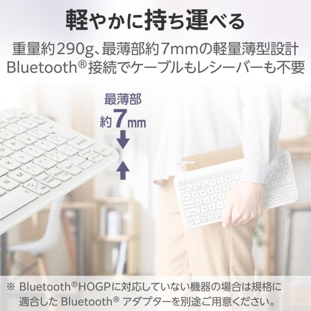 持ち運びに便利な薄型・軽量設計!Windows、macOS、 ChromeOS 、iOS/iPadOS、Androidを自動で識別し、各OSに最適な入力モードに切り替えが可能!マルチペアリング機能により、1つのキーボードで最大3台までのデバイスを瞬時に切り替えて使用できるBluetooth(R)パンタグラフミニキーボード“Slint(スリント)”です。![]() ■打ちやすさにこだわった、Bluetooth(R)軽量・薄型ミニキーボードです。 ■軽やかに持ち運べる重量約290g、最薄部約7mmの軽量薄型設計。 ■Bluetooth(R)HOGPに対応したパソコンであれば、レシーバーを接続することなくマウスを使用できるため、USBポートの少ないパソコンやタブレットにぴったりです。 ■※Bluetooth(R)HOGPに対応していないパソコンでも、規格に適合したBluetooth(R)アダプターを用意することで使用可能です。(推奨Bluetoothアダプター:LBT-UAN05C2シリーズ(別売品)) ■最大3台までのデバイスをペアリングできるマルチペアリングに対応しています。切り替え操作を行うことで、使用シーンに合わせてデバイスを瞬時に切り替えることができます。 ■専用ドライバーなどのインストールは不要で、ペアリングするだけですぐに使用可能です。 ■キータイプには、ノートパソコンのキーボードと同じ軽快な打ち心地の「パンタグラフ方式」を採用しています。 ■薄さを保ちながら指馴染みを高めた、こだわりのキートップ形状と、安定感抜群の大型の角度調整スタンドにより、いつでもどこでも心地よいタイピングが可能です。 ■キートップの印字にはスタイリッシュなオリジナルフォントを採用。かな表記を省き、ローマ字入力時に見やすくしています。 ■独自のファームウェアを搭載することにより、Windows、macOS、 ChromeOS 、iOS/iPadOS、Androidを自動で識別し、各OSに最適な入力モードに切り替えます。 ■キーボードの上段には、特定の機能を素早く実行できるマルチファンクションキーを搭載しています。 ■専用キーを押すだけで、ブラウザでのホームの表示、メディアプレーヤーの起動、音量や明るさの調整、スクリーンショットといった12種類の操作が可能です。 ■コンパクトな本体設計ながら、19mmのキーピッチで快適な文字入力を実現しました。 ■電源スイッチがあり、不使用時の電池の消耗を防止できます。 ■電源ON、ペアリング状況などが分かるLEDランプが付いています。 ■Bluetooth(R)5.0 Class2規格に適合しており、省電力を実現します。 ■使いやすい日本語配列を採用しています。 ■自社環境認定基準を1つ以上満たし、『THINK ECOLOGY』マークを表示した製品です。 ■廃棄物削減に取り組み、製品に同梱する取扱説明書等をペーパーレス化した製品です。 ![]() ■接続方式:Bluetooth(R)無線 ■Bluetooth規格:Bluetooth 5.0 Class2 ■対応プロファイル:HOGP(HID Over GATT Profile) ■対応機種:Bluetooth(R)HOGPプロファイルに対応したWindows、macOS、 ChromeOS 、iOS、iPadOS、Android搭載機 ■対応OS(Windows):Windows 11/10 ■対応OS(Android):Android 13 ■対応OS(macOS):macOS Ventura 13 ■対応OS(iOS):iOS 17 ■対応OS(iPadOS):iPadOS 17 ■通信方式:GFSK方式 ■電波周波数:2.4GHz帯 ■電波到達距離:最長約10m ※ご使用環境により異なる場合があります。 ■接続先切り替え機能:対応(Bluetooth(R):3台) ■キー配列:日本語配列 ■キー数:83キー ■キータイプ:パンタグラフ ■キーピッチ:19.0mm ■キーストローク:2.0mm ■マルチファンクション機能:13キー ■電源:単4形アルカリ乾電池、単4形マンガン乾電池、単4形ニッケル水素電池のいずれか2本 ■電池寿命:最長約22カ月(アルカリ乾電池使用時の目安) ※ご使用状況により異なる場合があります。 ■サイズ分類:ミニ ■外形寸法:幅約291mm×奥行約131mm×高さ約17mm ■重量:約290g ※電池含まず ■内容物:キーボード本体×1台、動作確認用単4形アルカリ乾電池×2本 ■カラー:ホワイト ■保証期間:1年間 |