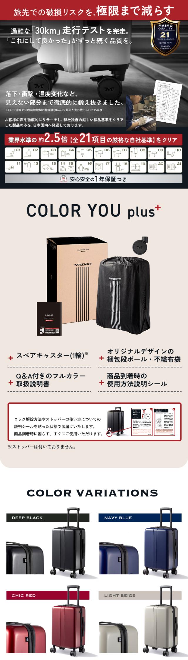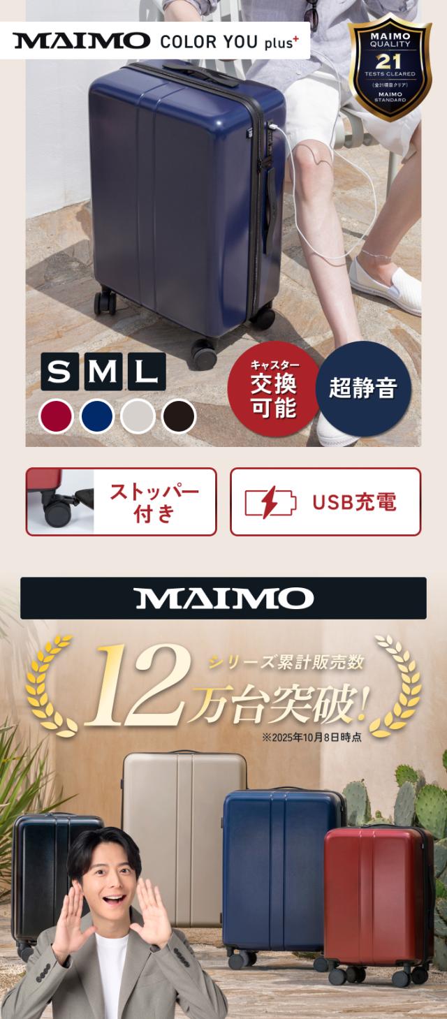 【商品詳細】製品名:COLOR YOU plus (Lサイズ)本体サイズ:高さ75×幅50×奥行30cm重量:約4.6kg容量:約95L素材:ケース/ポリカーボネート100% 内装/ポリエステル 部品/ポリウレタン ・ポリ塩化ビニル梱包サイズ:66×44.5×27.5cm保証期間:1年間付属品:交換用スペアキャスター(ストッパーなし)/梱包不織布袋/梱包段ボール/取扱説明書/製品保証書【キャスターストッパー】ストッパー機能を搭載。立ったまま踏むだけで、力を使わず簡単に固定と解除が可能です。MAIMOオリジナルキャスター。(意匠登録番号:1734959)【USBポート付きTSAロック】最新セキュリティーのTSA008モデルを採用。暗証番号タイプなので、鍵を持ち歩く必要がありません。USBポート搭載のため、ケース内にモバイルバッテリーを入れたまま給電可能。【多段階調整可能なキャリーバー&高品質ハンドル 】キャリーバーは使用シーンや身長に合わせて、お好みの高さで1cm単位で調整可能。オリジナルの高品質ハンドルは、やわらかい持ち手で階段の上り下りも快適。