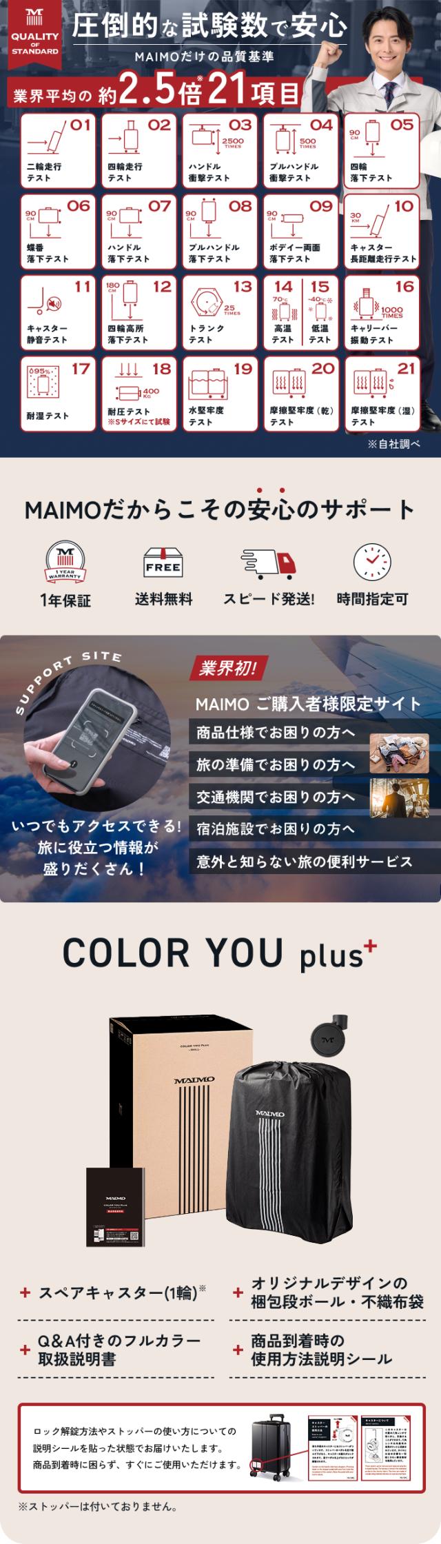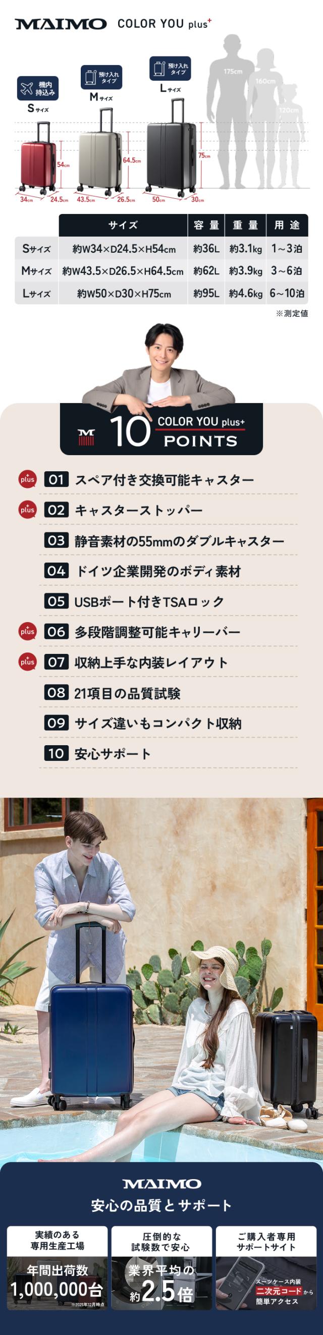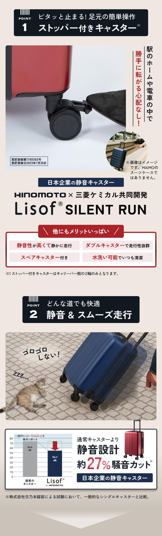 【キャスターストッパー】ストッパー機能を搭載。立ったまま踏むだけで、力を使わず簡単に固定と解除が可能です。MAIMOオリジナルキャスター。(意匠登録番号:1734959)【USBポート付きTSAロック】最新セキュリティーのTSA008モデルを採用。暗証番号タイプなので、鍵を持ち歩く必要がありません。USBポート搭載のため、ケース内にモバイルバッテリーを入れたまま給電可能。【多段階調整可能なキャリーバー&高品質ハンドル 】キャリーバーは使用シーンや身長に合わせて、お好みの高さで1cm単位で調整可能。オリジナルの高品質ハンドルは、やわらかい持ち手で階段の上り下りも快適。
