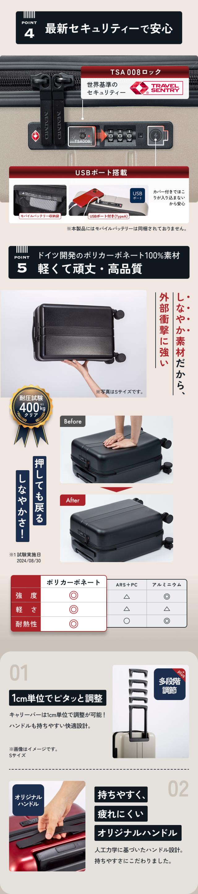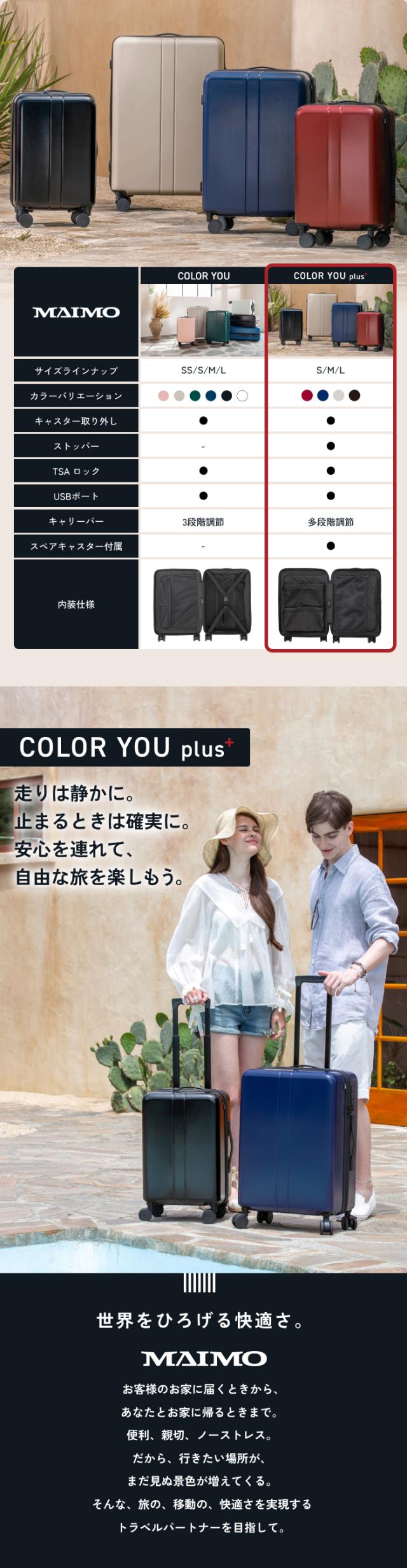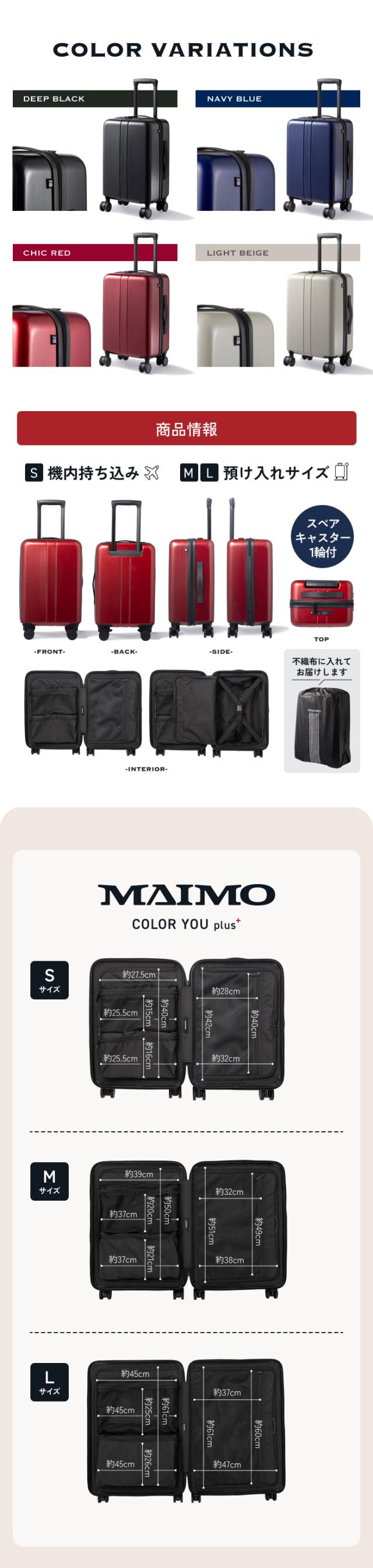 【キャスターストッパー】ストッパー機能を搭載。立ったまま踏むだけで、力を使わず簡単に固定と解除が可能です。MAIMOオリジナルキャスター。(意匠登録番号:1734959)【USBポート付きTSAロック】最新セキュリティーのTSA008モデルを採用。暗証番号タイプなので、鍵を持ち歩く必要がありません。USBポート搭載のため、ケース内にモバイルバッテリーを入れたまま給電可能。【多段階調整可能なキャリーバー&高品質ハンドル 】キャリーバーは使用シーンや身長に合わせて、お好みの高さで1cm単位で調整可能。オリジナルの高品質ハンドルは、やわらかい持ち手で階段の上り下りも快適。